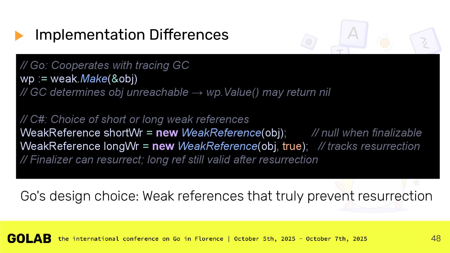 := weak.Make(&obj) // GC determines obj unreachable → wp.Value() may return nil // C#: Choice of short or long weak references WeakReference shortWr = new WeakReference(obj); // null when finalizable WeakReference longWr = new WeakReference(obj, true); // tracks resurrection // Finalizer can resurrect; long ref still valid after resurrection Go's design choice: Weak references that truly prevent resurrection
