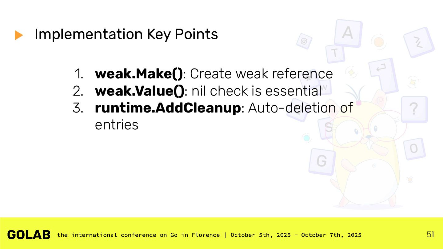 weak.Value(): nil check is essential 3. runtime.AddCleanup: Auto-deletion of entries