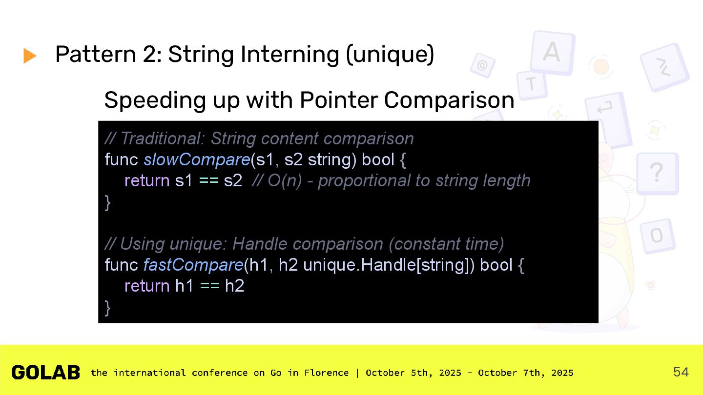 comparison func slowCompare(s1, s2 string) bool { return s1 == s2 // O(n) - proportional to string length } // Using unique: Handle comparison (constant time) func fastCompare(h1, h2 unique.Handle[string]) bool { return h1 == h2 } Speeding up with Pointer Comparison
