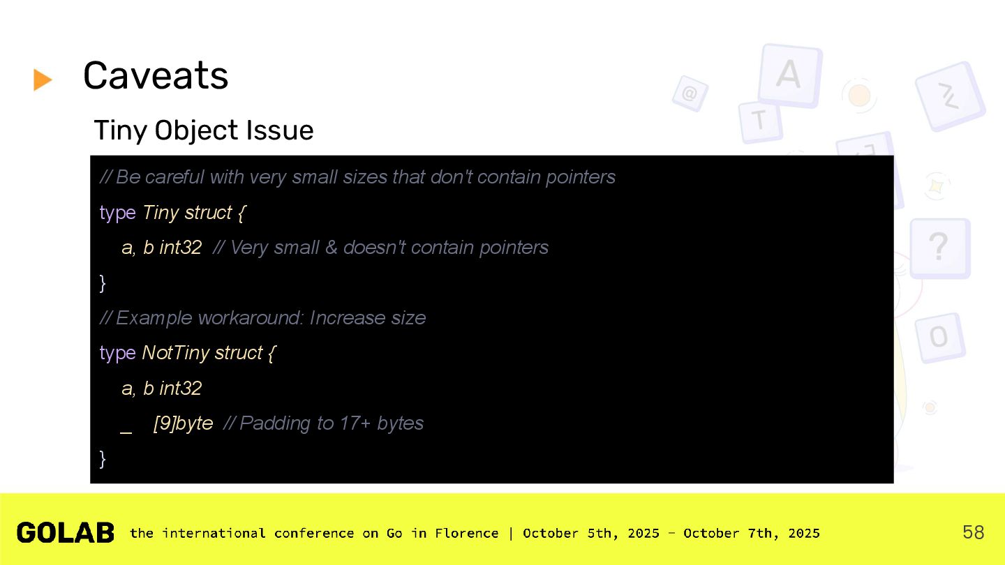small sizes that don't contain pointers type Tiny struct { a, b int32 // Very small & doesn't contain pointers } // Example workaround: Increase size type NotTiny struct { a, b int32 _ [9]byte // Padding to 17+ bytes }