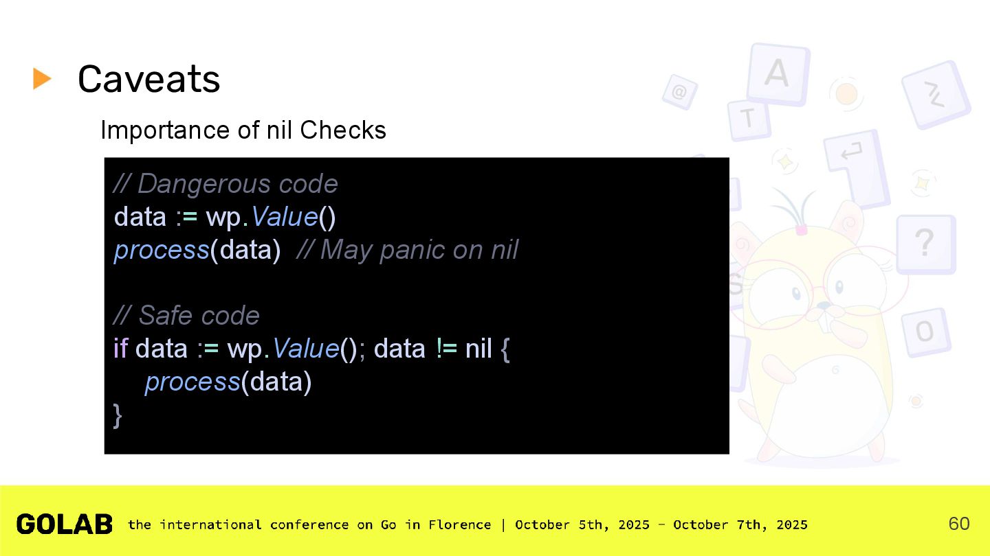 May panic on nil // Safe code if data := wp.Value(); data != nil { process(data) } Importance of nil Checks