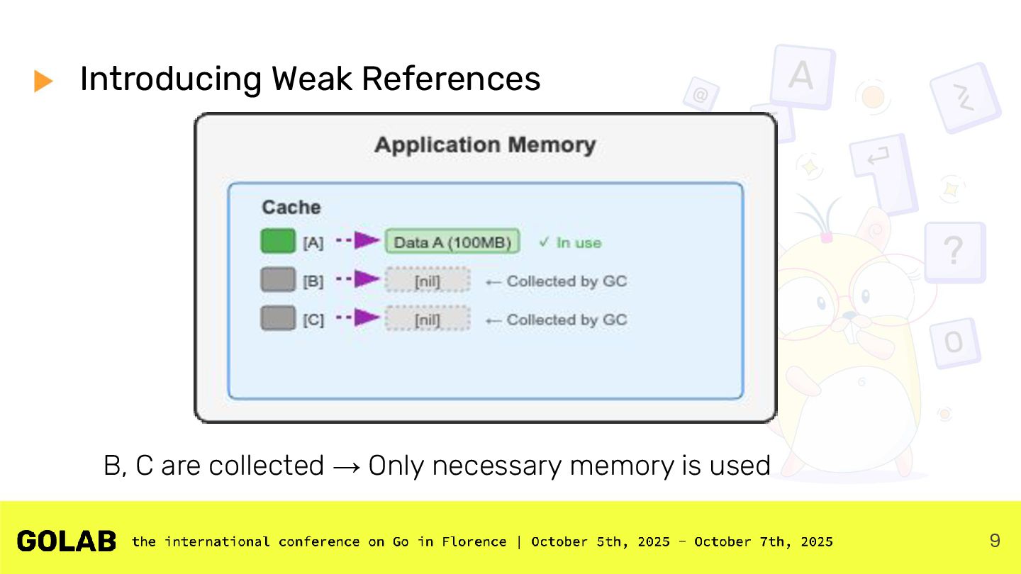 automatically collected by GC By using weak pointers, data is automatically GC'd when no longer needed cache.Store(key, weak.Make(data)) if wp := cache.Load(key); wp.Value() != nil { return wp.Value() // Still alive }