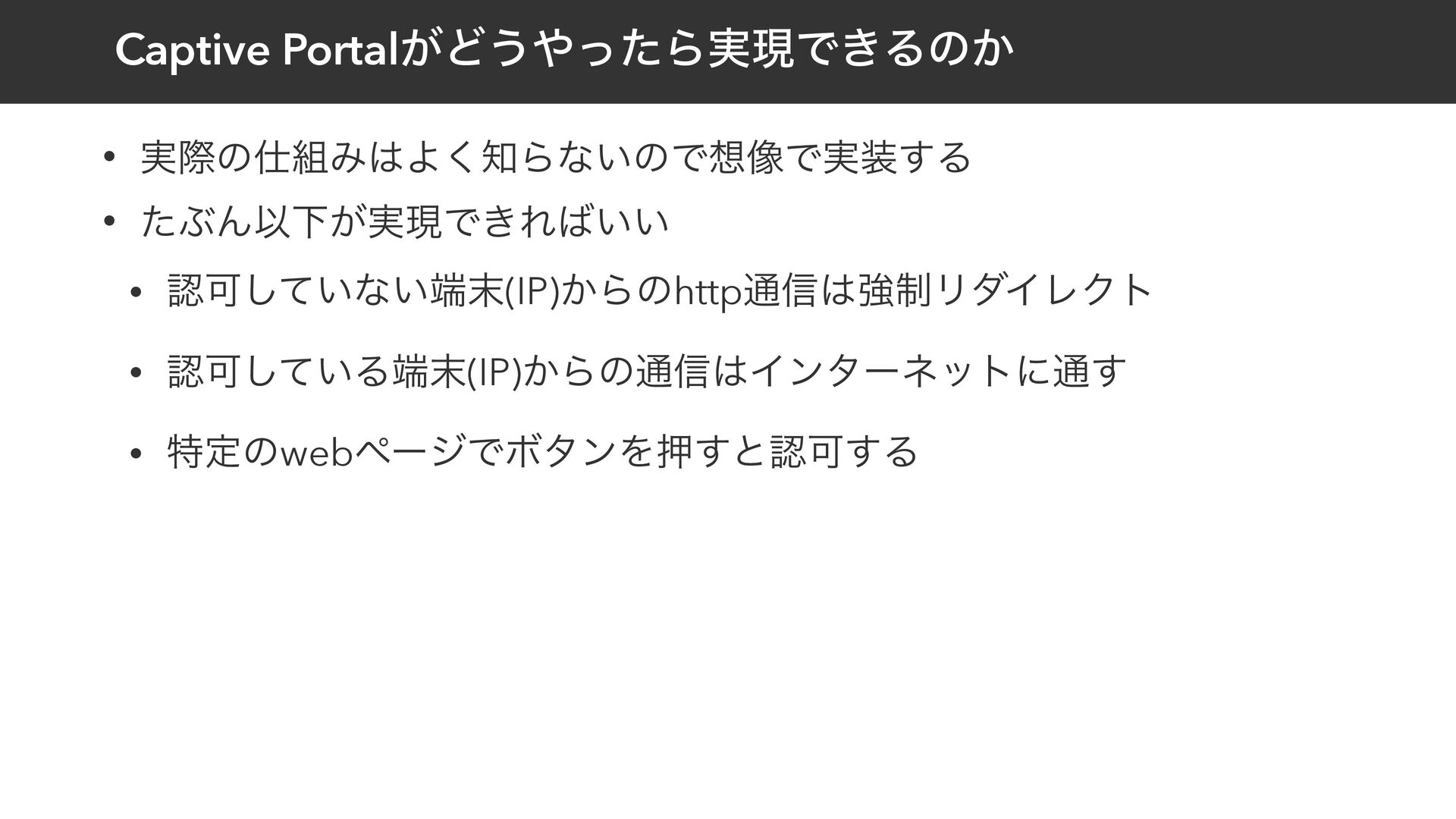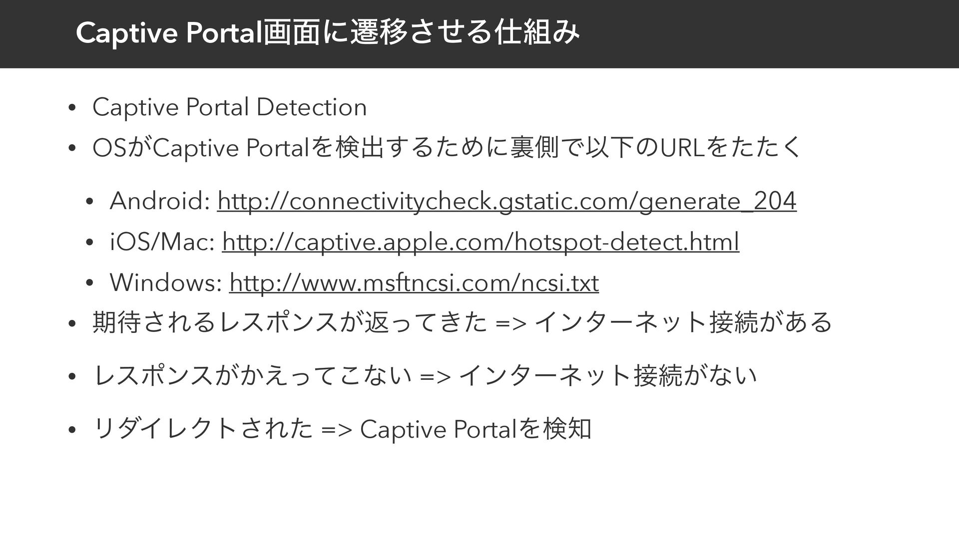 Android: http://connectivitycheck.gstatic.com/generate_204 • iOS/Mac: http://captive.apple.com/hotspot-detect.html • Windows: http://www.msftncsi.com/ncsi.txt • ظ͞ΕΔϨεϙϯε͕ฦ͖ͬͯͨ => Πϯλʔωοτଓ͕͋Δ • Ϩεϙϯε͕͔͑ͬͯ͜ͳ͍ => Πϯλʔωοτଓ͕ͳ͍ • ϦμΠϨΫτ͞Εͨ => Captive PortalΛݕ