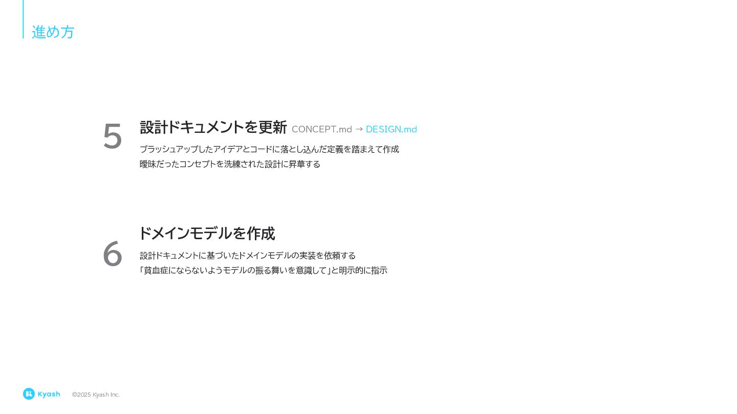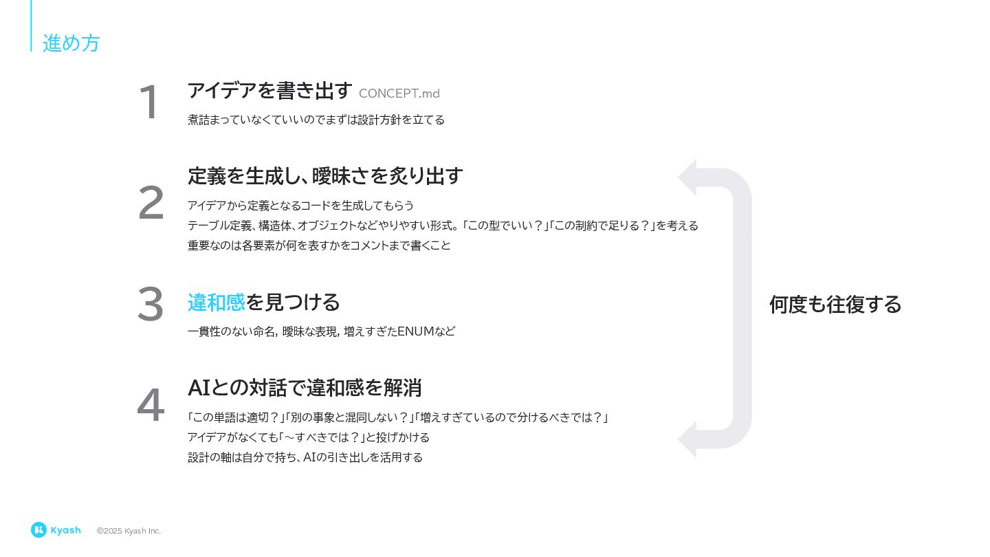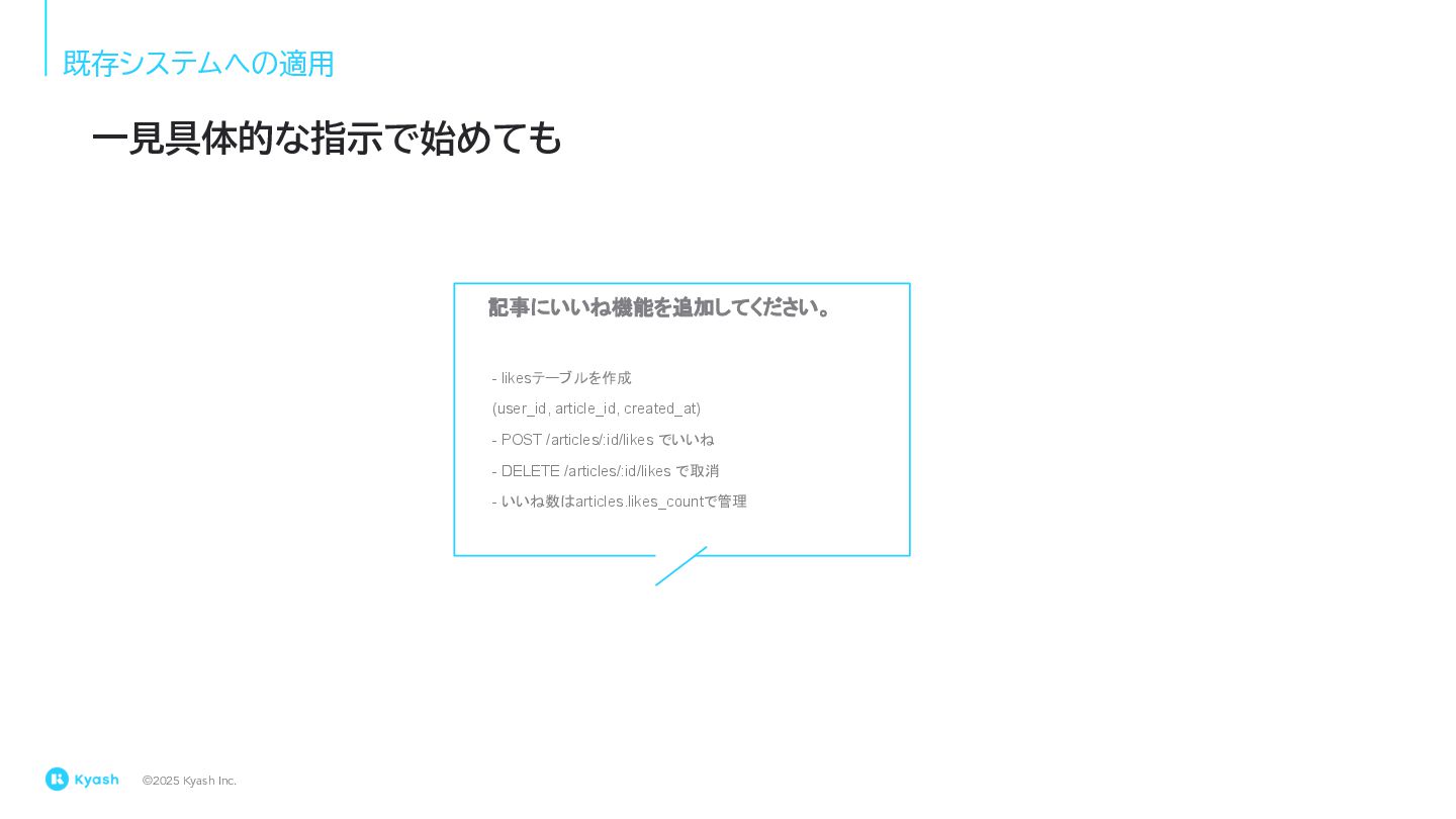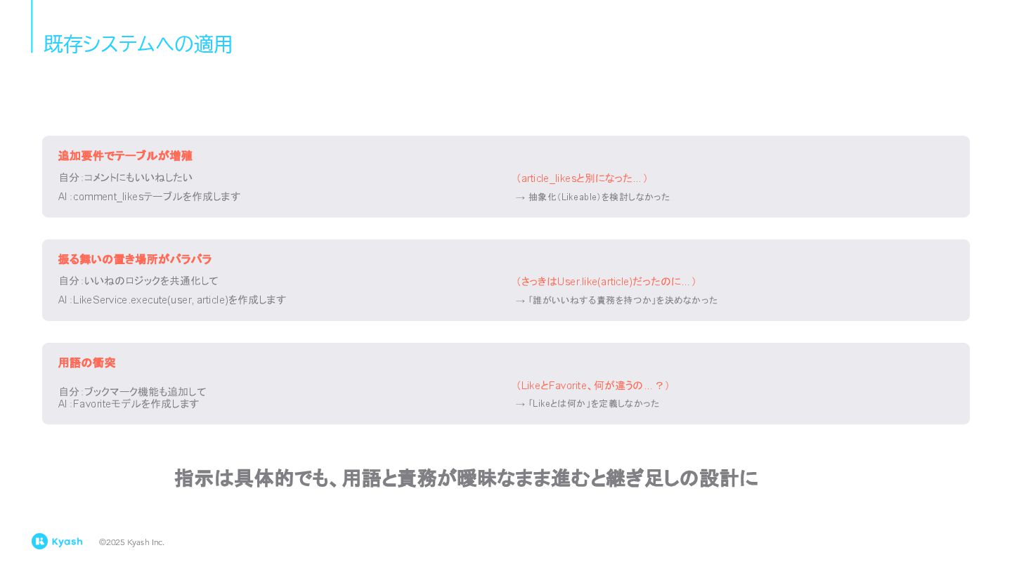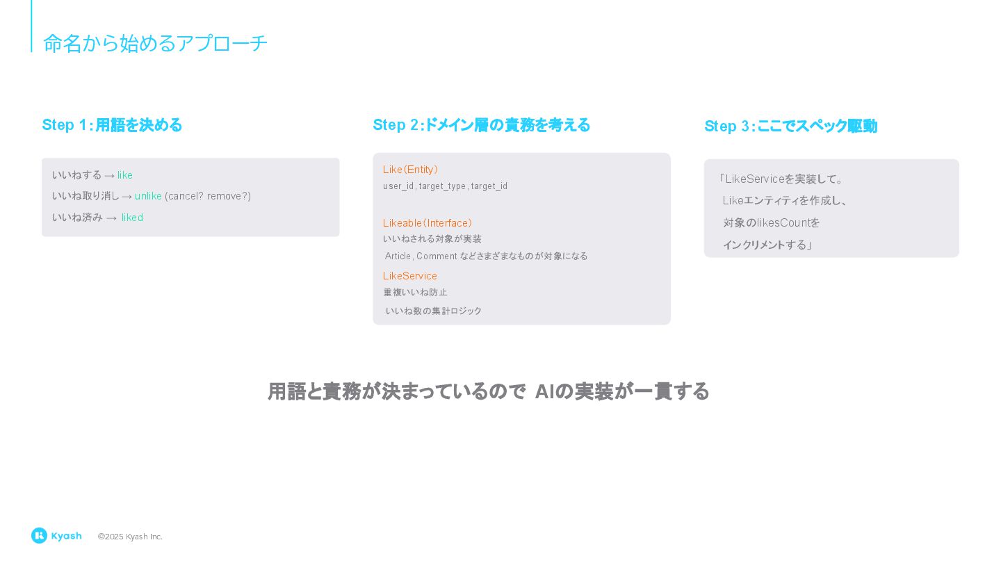→ unlike (cancel? remove?) いいね済み → liked Step 2:ドメイン層の責務を考える Like(Entity) user_id, target_type, target_id Likeable(Interface) いいねされる対象が実装 Article, Comment などさまざまなものが対象になる LikeService 重複いいね防止 いいね数の集計ロジック Step 3:ここでスペック駆動 「LikeServiceを実装して。 Likeエンティティを作成し、 対象のlikesCountを インクリメントする」 用語と責務が決まっているので AIの実装が一貫する