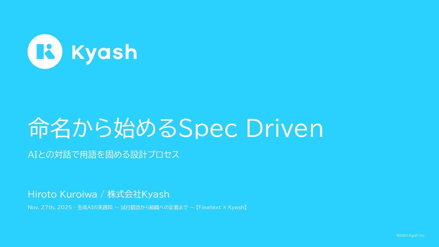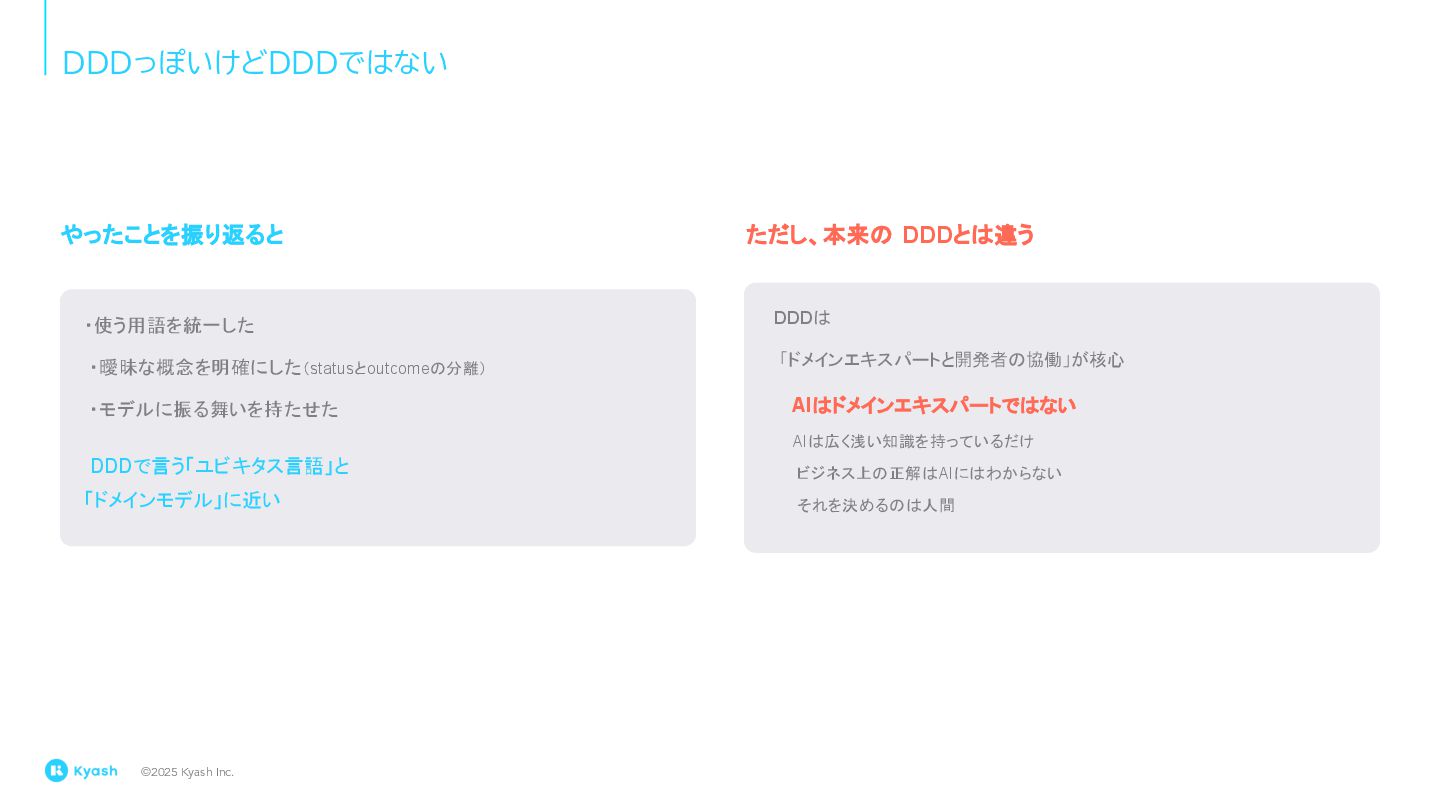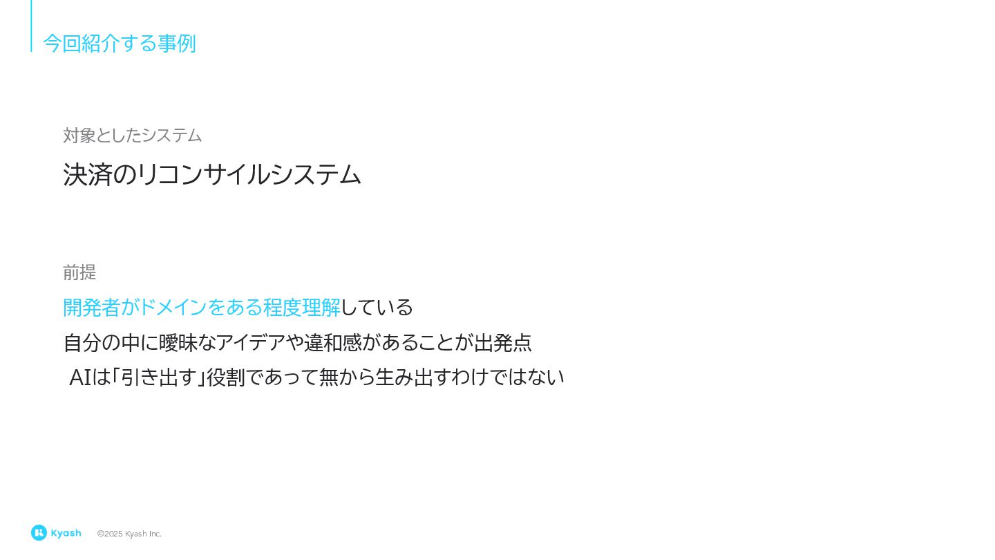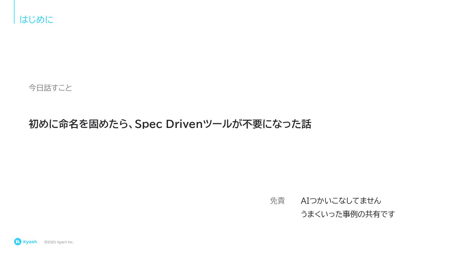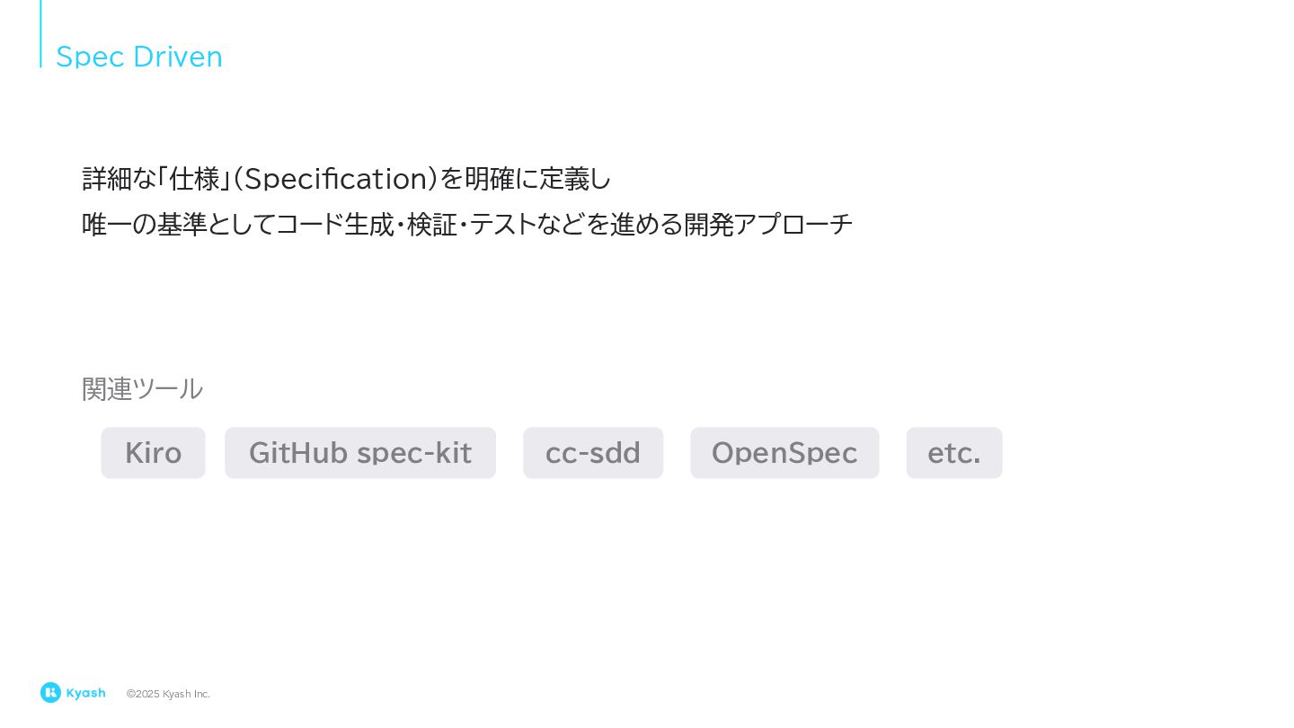 → unlike (cancel? remove?) いいね済み → liked Step 2:ドメイン層の責務を考える Like(Entity) user_id, target_type, target_id Likeable(Interface) いいねされる対象が実装 Article, Comment などさまざまなものが対象になる LikeService 重複いいね防止 いいね数の集計ロジック Step 3:ここでスペック駆動 「LikeServiceを実装して。 Likeエンティティを作成し、 対象のlikesCountを インクリメントする」 用語と責務が決まっているので AIの実装が一貫する
