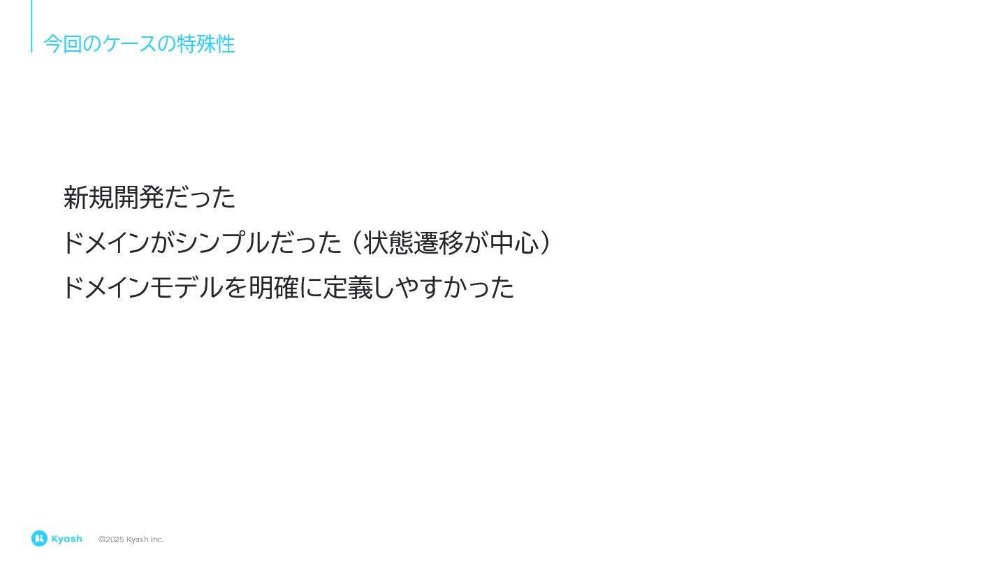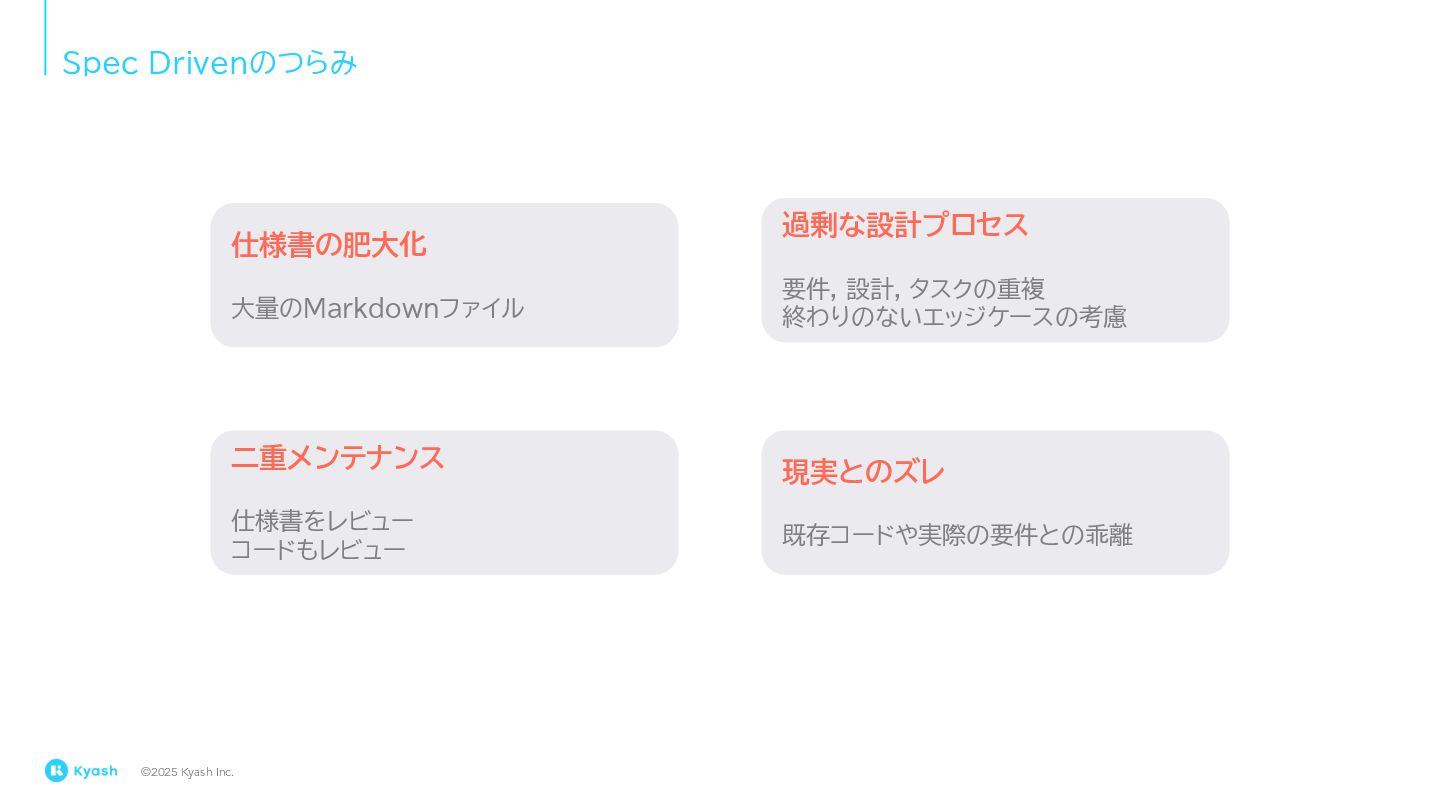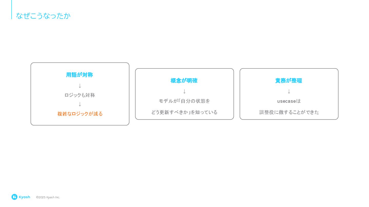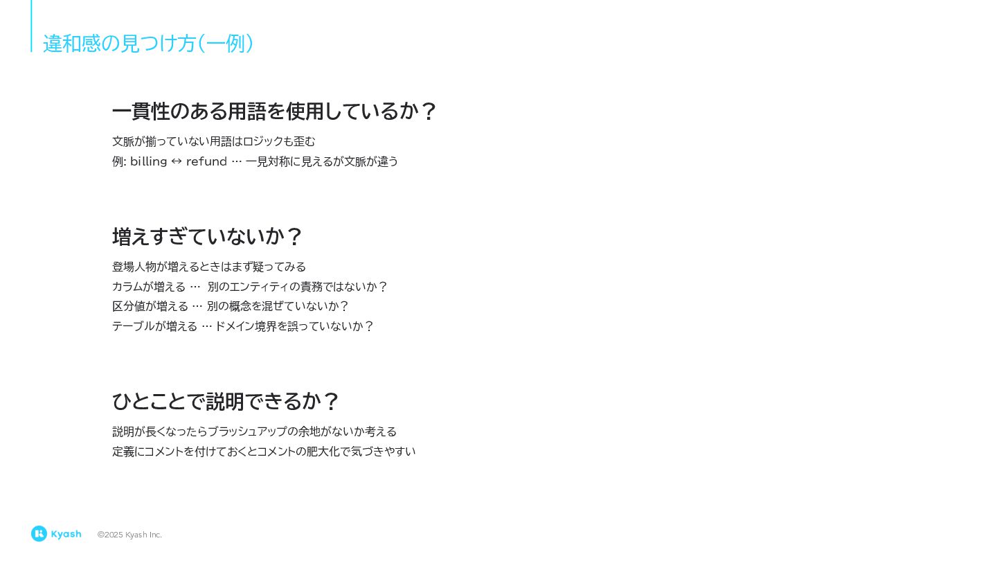 → unlike (cancel? remove?) いいね済み → liked Step 2:ドメイン層の責務を考える Like(Entity) user_id, target_type, target_id Likeable(Interface) いいねされる対象が実装 Article, Comment などさまざまなものが対象になる LikeService 重複いいね防止 いいね数の集計ロジック Step 3:ここでスペック駆動 「LikeServiceを実装して。 Likeエンティティを作成し、 対象のlikesCountを インクリメントする」 用語と責務が決まっているので AIの実装が一貫する