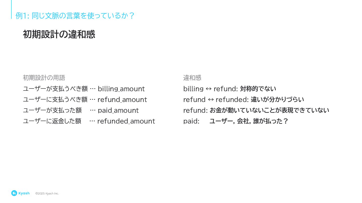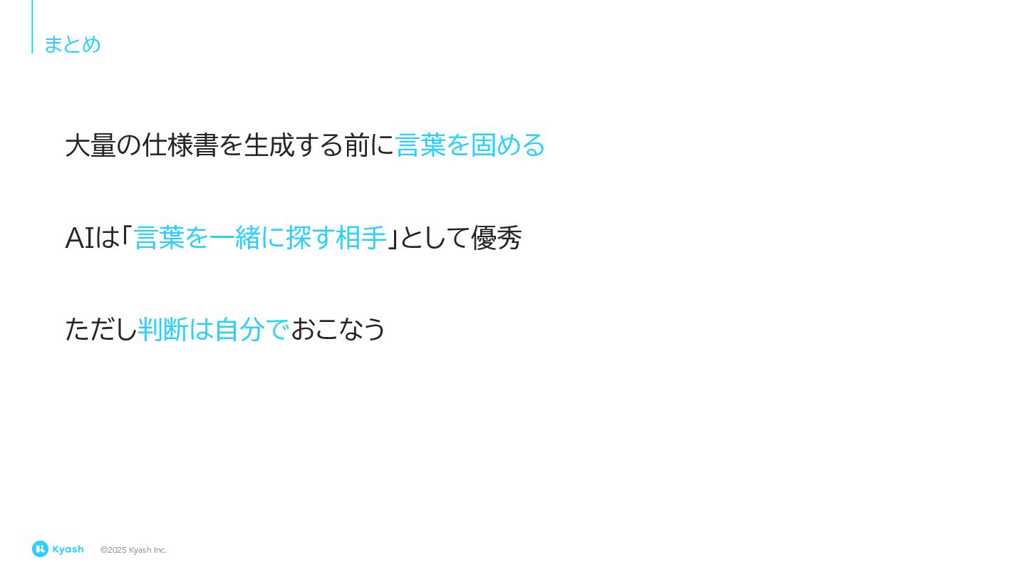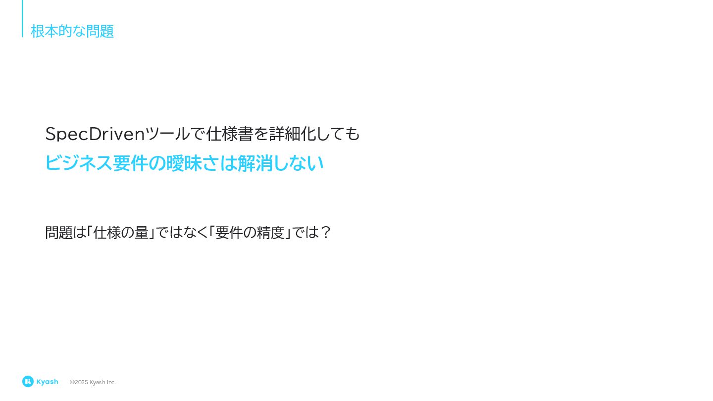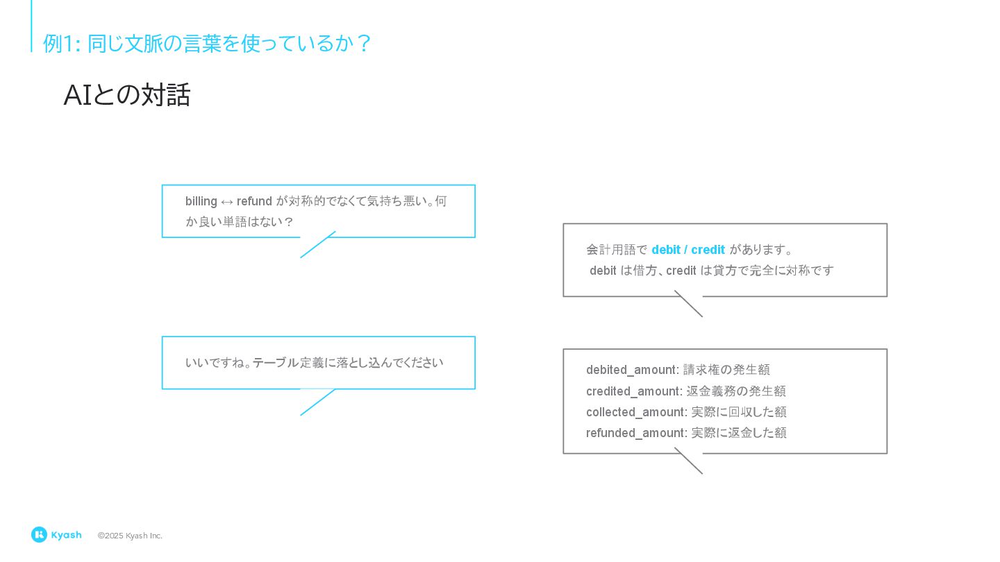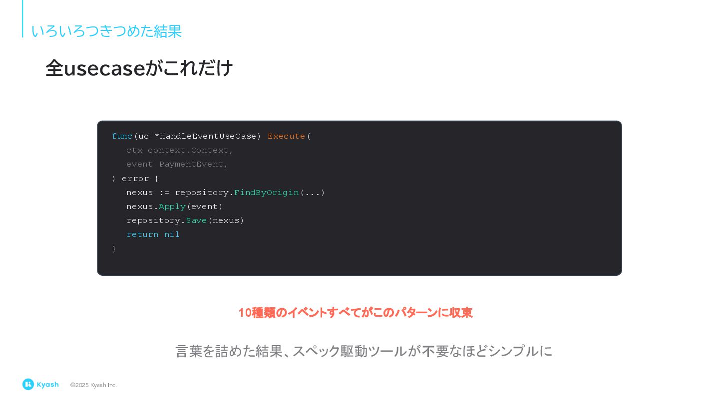 → unlike (cancel? remove?) いいね済み → liked Step 2:ドメイン層の責務を考える Like(Entity) user_id, target_type, target_id Likeable(Interface) いいねされる対象が実装 Article, Comment などさまざまなものが対象になる LikeService 重複いいね防止 いいね数の集計ロジック Step 3:ここでスペック駆動 「LikeServiceを実装して。 Likeエンティティを作成し、 対象のlikesCountを インクリメントする」 用語と責務が決まっているので AIの実装が一貫する