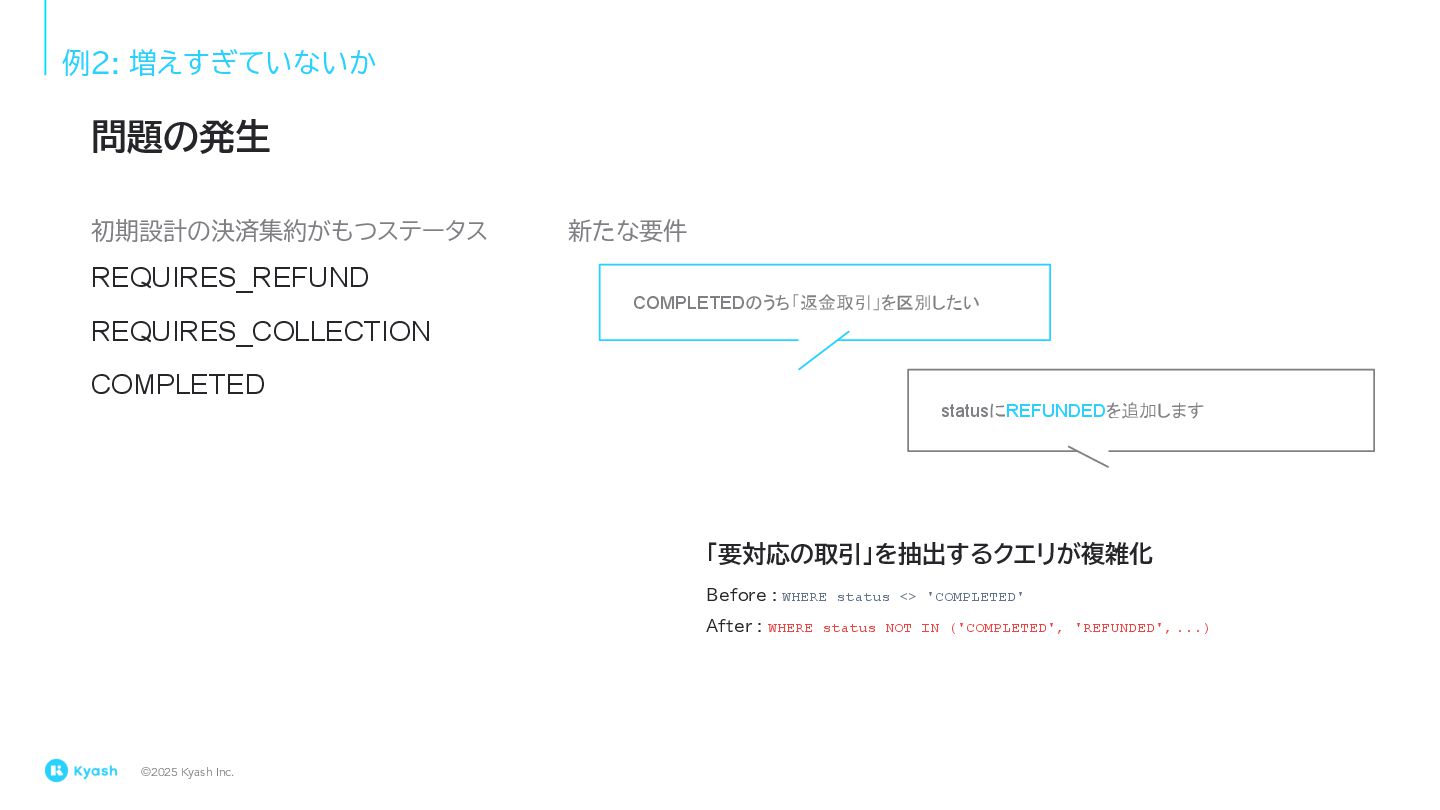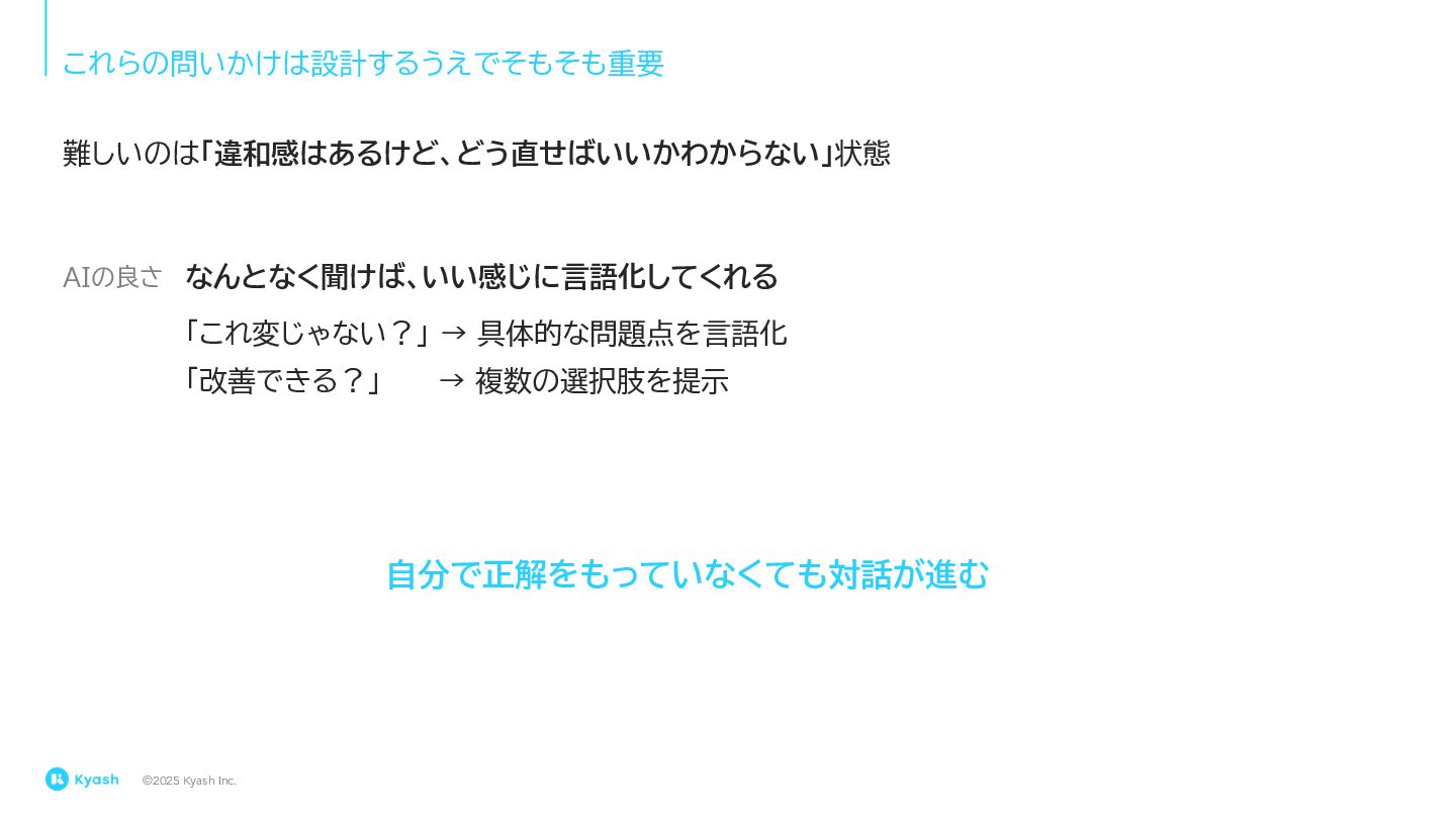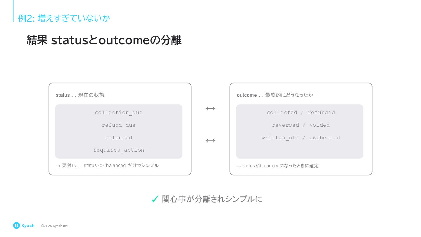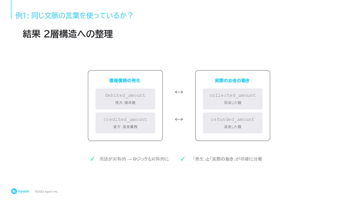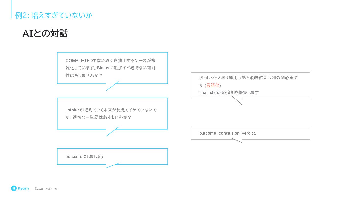 → unlike (cancel? remove?) いいね済み → liked Step 2:ドメイン層の責務を考える Like(Entity) user_id, target_type, target_id Likeable(Interface) いいねされる対象が実装 Article, Comment などさまざまなものが対象になる LikeService 重複いいね防止 いいね数の集計ロジック Step 3:ここでスペック駆動 「LikeServiceを実装して。 Likeエンティティを作成し、 対象のlikesCountを インクリメントする」 用語と責務が決まっているので AIの実装が一貫する