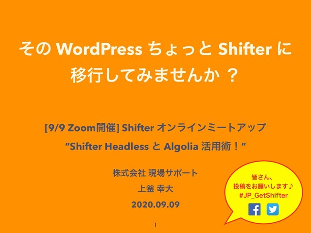 ΦϯϥΠϯϛʔτΞοϓ “Shifter Headless ͱ Algolia ׆༻ज़ʂ” גࣜձࣾ ݱαϙʔτ ্佂 େ 2020.09.09 օ͞Μɺ ߘΛ͓ئ͍͠·̇͢ +1@(FU4IJGUFS
