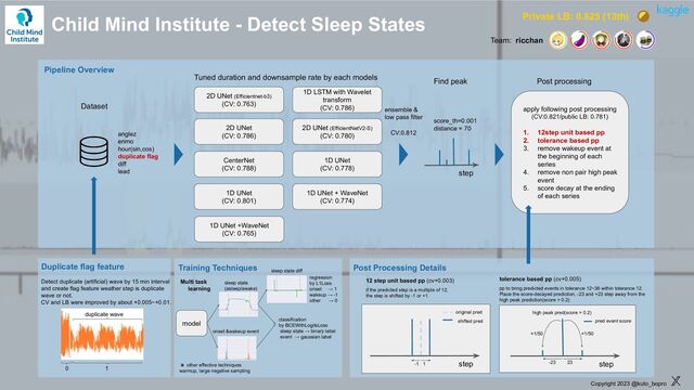 Private LB: 0.825 (13th) 2D UNet (Efficientnet-b3) (CV: 0.763) 2D UNet (CV: 0.786) CenterNet (CV: 0.788) 1D UNet (CV: 0.801) 1D LSTM with Wavelet transform (CV: 0.786) 2D UNet (EfficientNetV2-S) (CV: 0.780) 1D UNet (CV: 0.778) 1D UNet + WaveNet (CV: 0.774) Duplicate flag feature Training Techniques Post Processing Details anglez enmo hour(sin,cos) duplicate flag diff lead Pipeline Overview Tuned duration and downsample rate by each models score_th=0.001 distance = 70 apply following post processing (CV:0.821/public LB: 0.781) 1. 12step unit based pp 2. tolerance based pp 3. remove wakeup event at the beginning of each series 4. remove non pair high peak event 5. score decay at the ending of each series Post processing Find peak Detect duplicate (artificial) wave by 15 min interval and create flag feature weather step is duplicate wave or not. CV and LB were improved by about +0.005~+0.01. 1D UNet +WaveNet (CV: 0.765) tolerance based pp (cv+0.005) pp to bring predicted events in tolerance 12~36 within tolerance 12. Place the score-decayed prediction, -23 and +23 step away from the high peak prediction(score > 0.2). CV:0.812 Team: ricchan Dataset ensemble & low pass filter Multi task learning model sleep state (asleep/awake) onset &wakeup event classification by BCEWithLogitsLoss sleep state → binary label event → gaussian label regression by L1Loss onset → 1 wakeup → -1 other → 0 sleep state diff step 0 1 duplicate wave ◾ other effective techniques warmup, large negative sampling step high peak pred(score > 0.2) -23 23 ×1/50 ×1/50 pred event score step 12 step unit based pp (cv+0.003) if the predicted step is a multiple of 12, the step is shifted by -1 or +1. original pred shifted pred -1 1