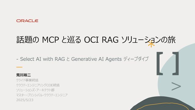 2025年5月23日(金)に開催された Developer Day 2025 のブレイクアウトセッション [T1-4] 「話題の MCP と巡る OCI RAG ソリューションの旅 - Select AI with RAG と Generative AI Agents ディープダイブ」の登壇資料です。