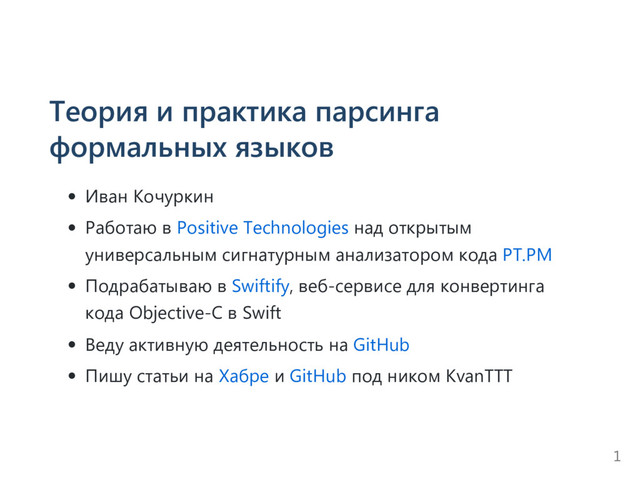 В докладе рассказывается об инструментах и практиках парсинга формальных языков: как исходного кода, так и собственных предметно-ориентированных (DSL). О том, какие бывают парсеры и проблемы при их использовании. Доклад повествует как о базовых вещах: о токенах, деревьях разбора, абстрактных синтаксических деревьях (AST), так и о продвинутых: о методах обработки препроцессорных директив и восстановления от ошибок, о парсинге островных, нечувствительных к регистру языков и фрагментов кода. Помимо парсинга в докладе затрагивается тема обработки древовидных структур. Материал доклада основан на практических задачах и акцентирован на технологиях ANTLR и Roslyn.