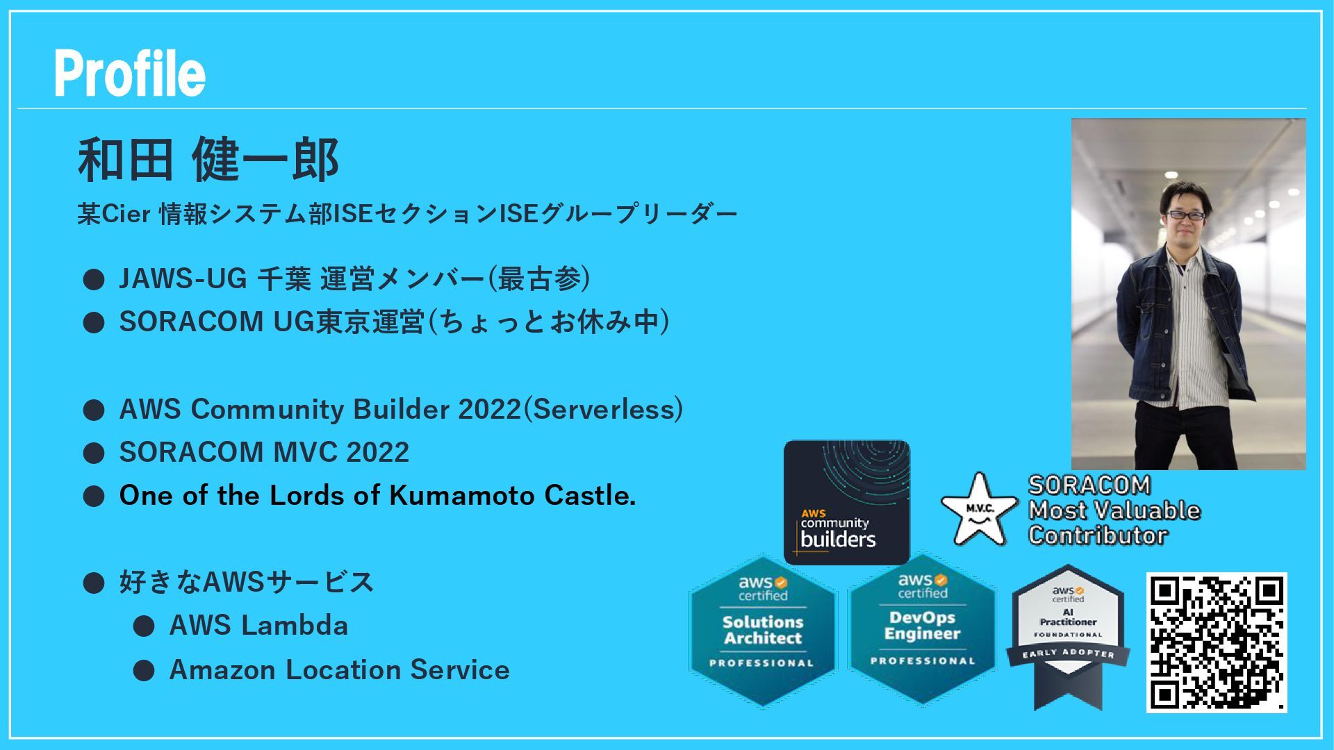 SORACOM UG東京運営(ちょっとお休み中) • AWS Community Builder 2022(Serverless) • SORACOM MVC 2022 • One of the Lords of Kumamoto Castle. • 好きなAWSサービス • AWS Lambda • Amazon Location Service