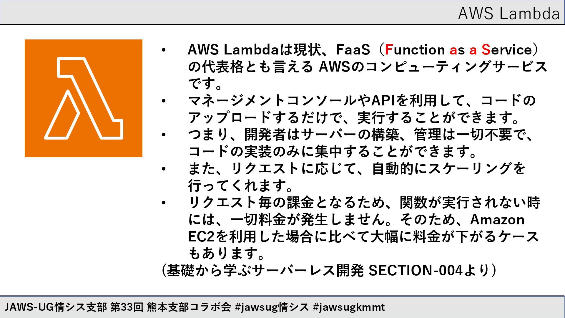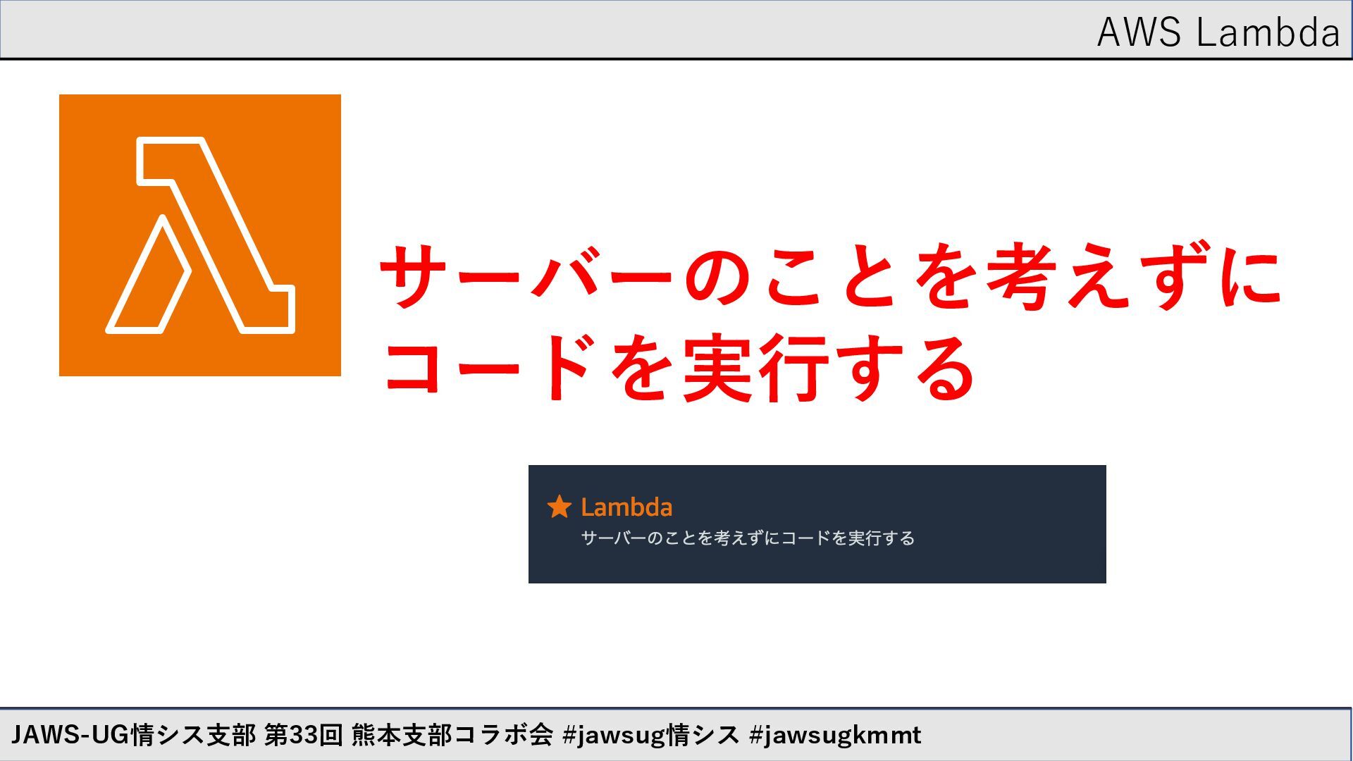 AWS Lambda JAWS-UG情シス支部 第33回 熊本支部コラボ会 #jawsug情シス #jawsugkmmt サーバーのことを考えずに コードを実行する
