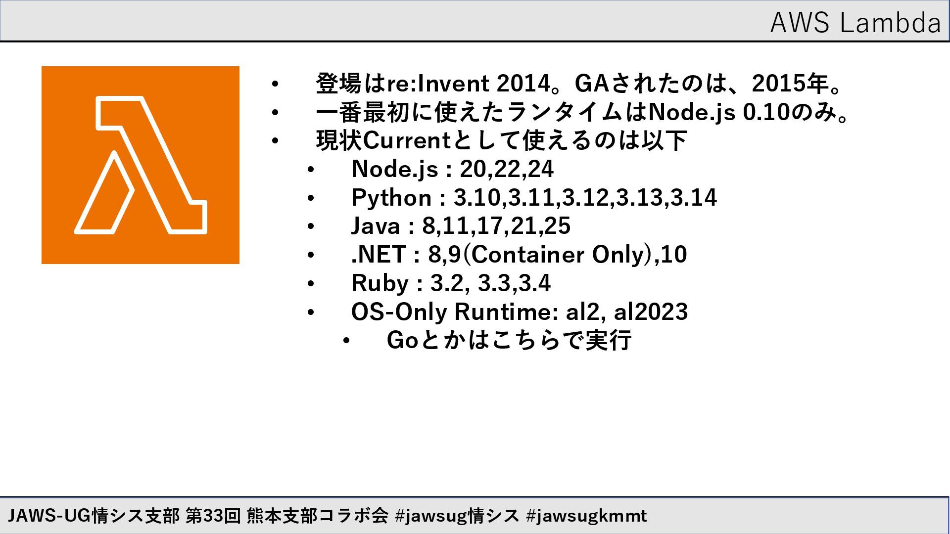 • 一番最初に使えたランタイムはNode.js 0.10のみ。 • 現状Currentとして使えるのは以下 • Node.js : 20,22,24 • Python : 3.10,3.11,3.12,3.13,3.14 • Java : 8,11,17,21,25 • .NET : 8,9(Container Only),10 • Ruby : 3.2, 3.3,3.4 • OS-Only Runtime: al2, al2023 • Goとかはこちらで実行