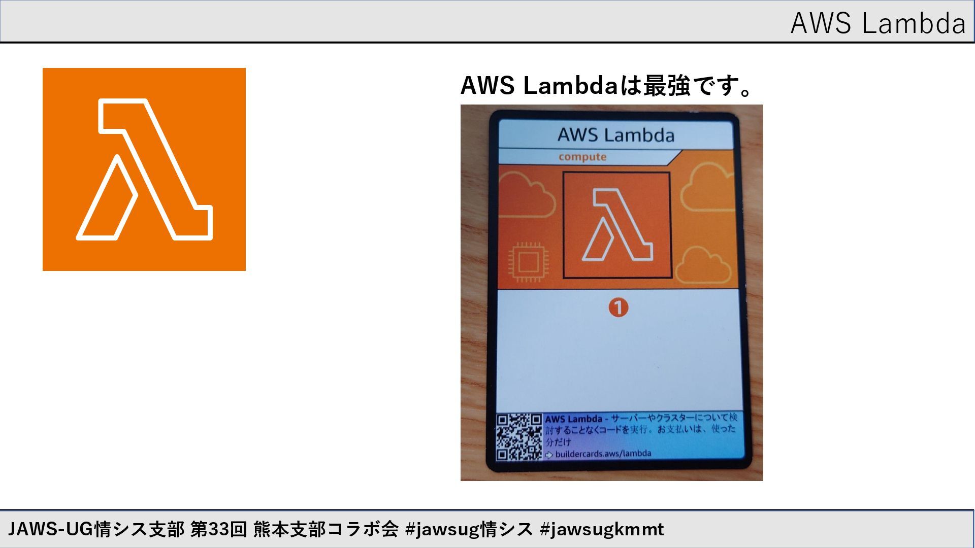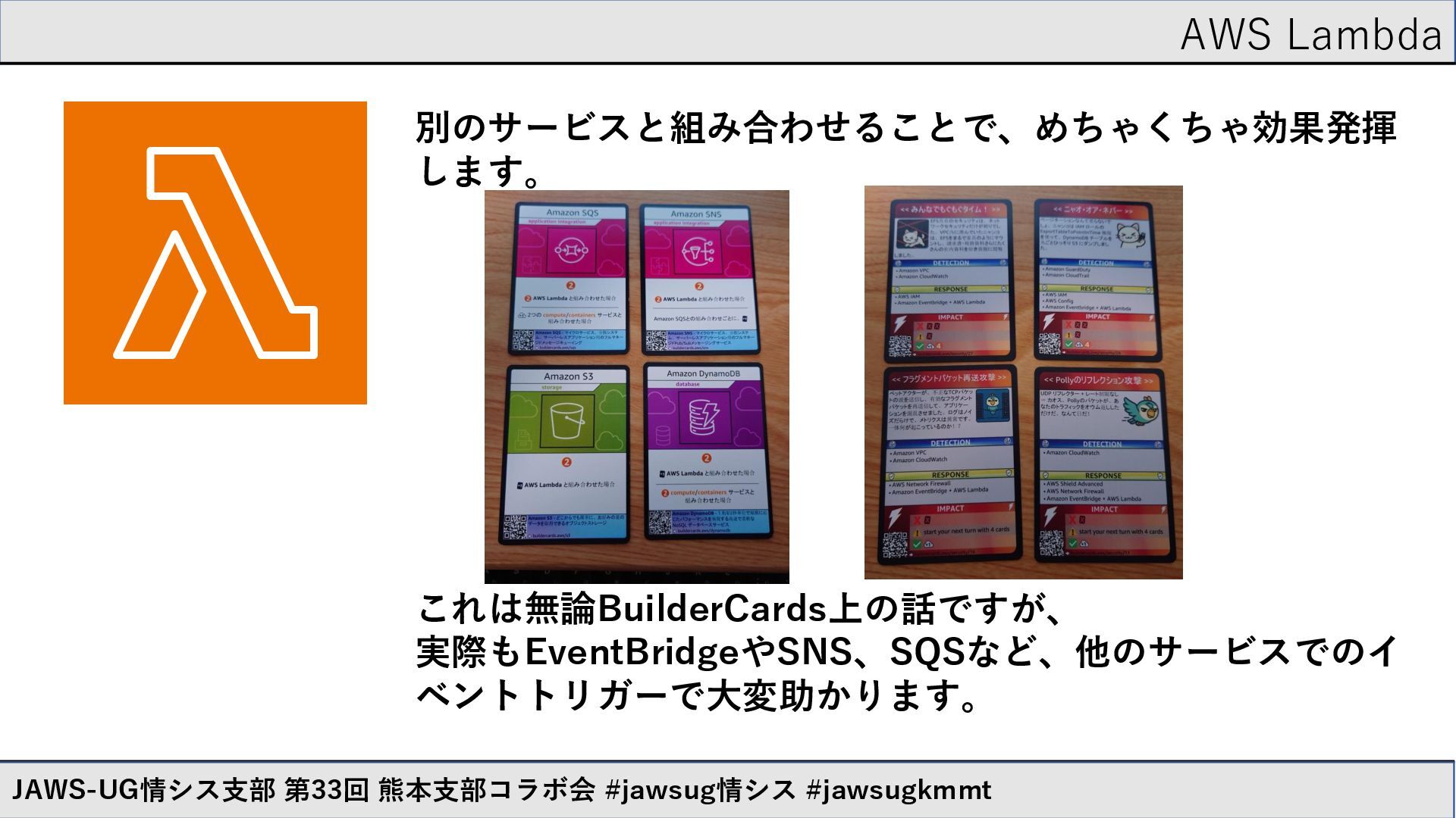 AWS Lambda JAWS-UG情シス支部 第33回 熊本支部コラボ会 #jawsug情シス #jawsugkmmt 別のサービスと組み合わせることで、めちゃくちゃ効果発揮 します。 これは無論BuilderCards上の話ですが、