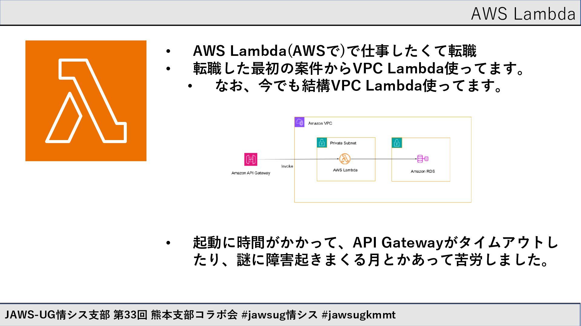 • 転職した最初の案件からVPC Lambda使ってます。 • なお、今でも結構VPC Lambda使ってます。 • 起動に時間がかかって、API Gatewayがタイムアウトし たり、謎に障害起きまくる月とかあって苦労しました。