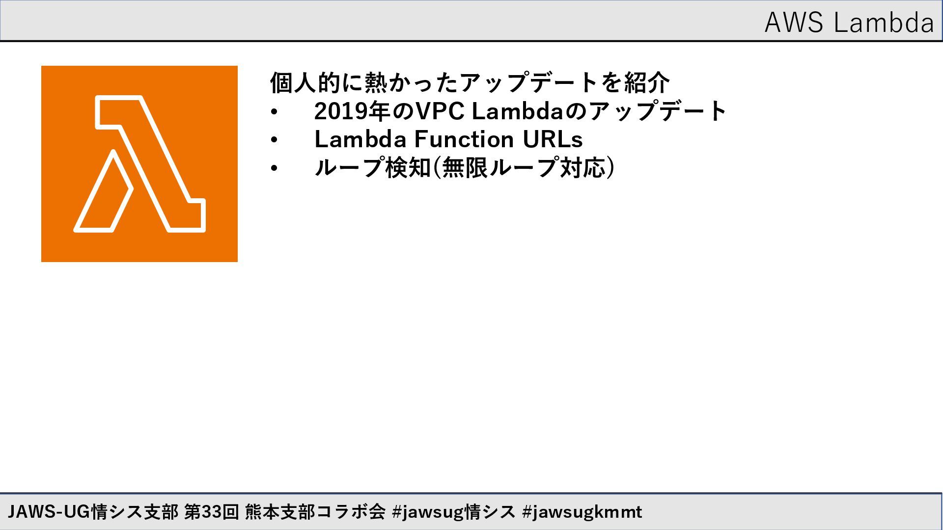 AWS Lambda JAWS-UG情シス支部 第33回 熊本支部コラボ会 #jawsug情シス #jawsugkmmt AWS Lambdaは最強です。