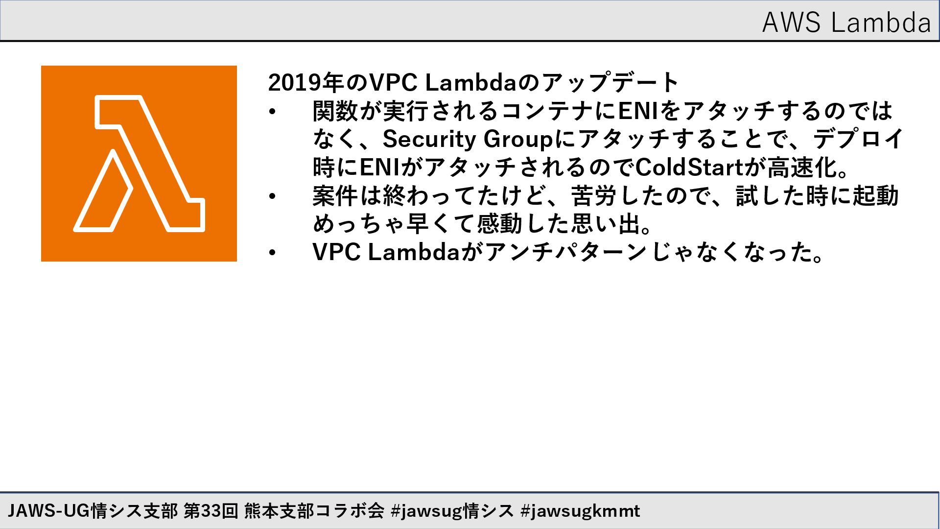 AWS Lambda JAWS-UG情シス支部 第33回 熊本支部コラボ会 #jawsug情シス #jawsugkmmt 個人的に熱かったアップデートを紹介 • 2019年のVPC