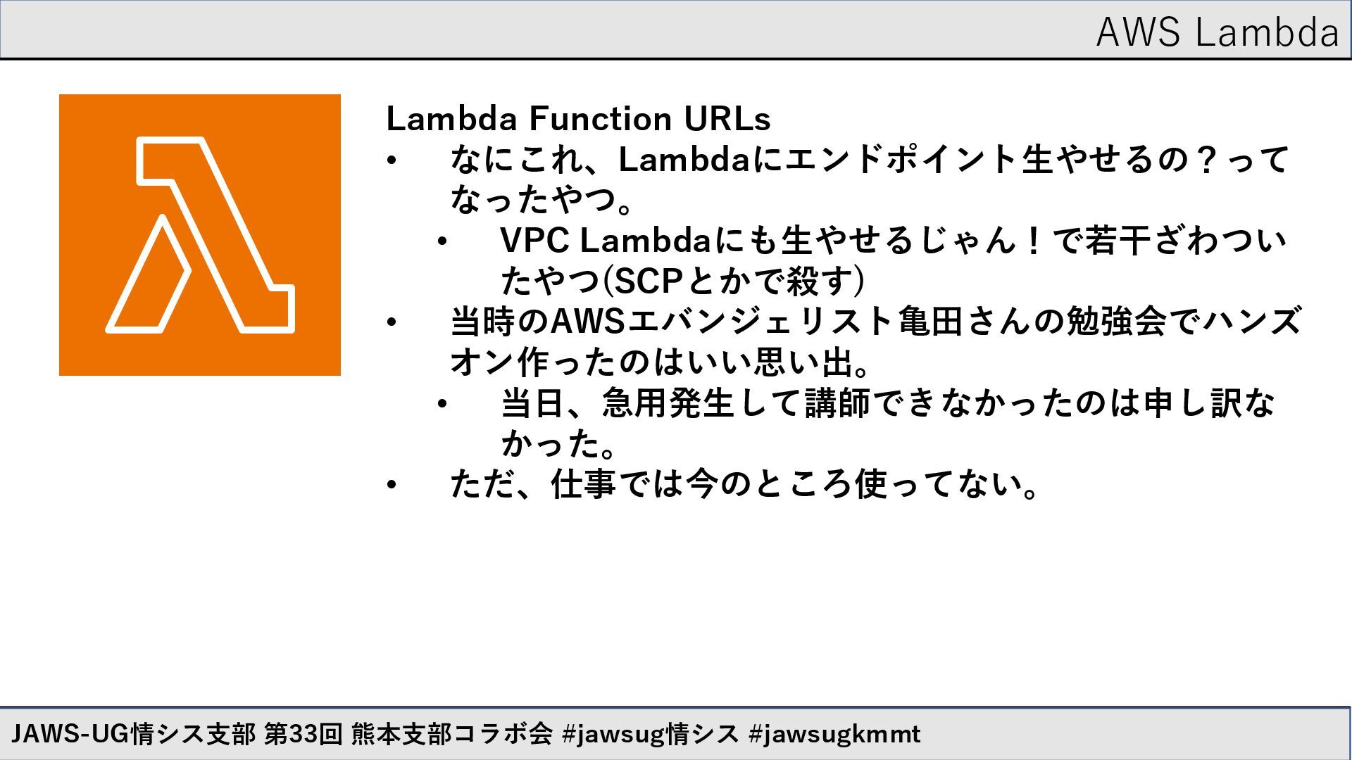 AWS Lambda JAWS-UG情シス支部 第33回 熊本支部コラボ会 #jawsug情シス #jawsugkmmt Lambda Function URLs