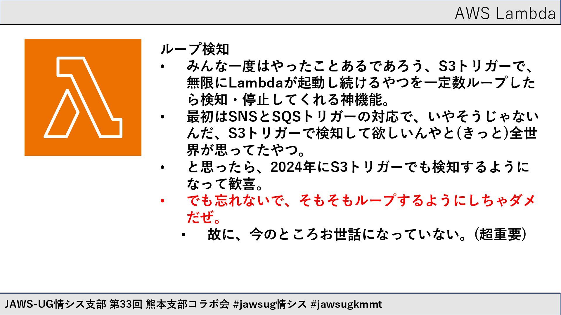 AWS Lambda JAWS-UG情シス支部 第33回 熊本支部コラボ会 #jawsug情シス #jawsugkmmt ループ検知 • みんな一度はやったことあるであろう、S3トリガーで、