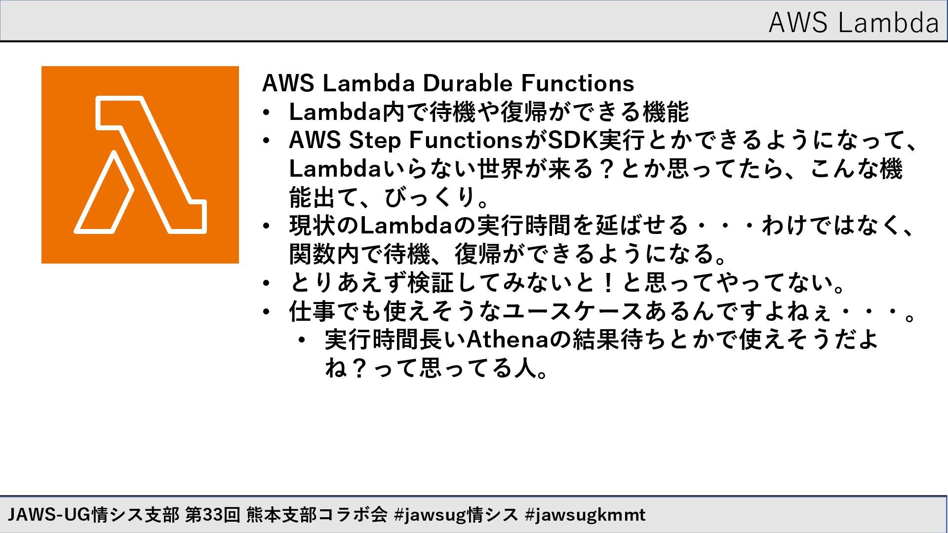 AWS Lambda JAWS-UG情シス支部 第33回 熊本支部コラボ会 #jawsug情シス #jawsugkmmt AWS Lambda Durable