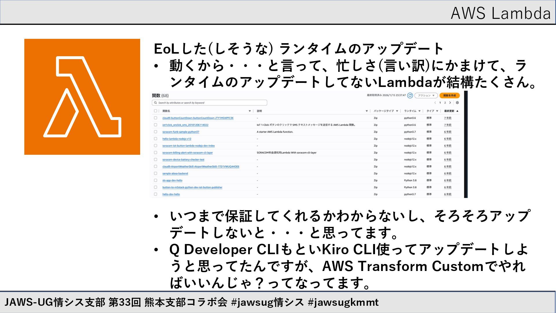 動くから・・・と言って、忙しさ(言い訳)にかまけて、ラ ンタイムのアップデートしてないLambdaが結構たくさん。 • いつまで保証してくれるかわからないし、そろそろアップ デートしないと・・・と思ってます。 • Q Developer CLIもといKiro CLI使ってアップデートしよ うと思ってたんですが、AWS Transform Customでやれ ばいいんじゃ?ってなってます。