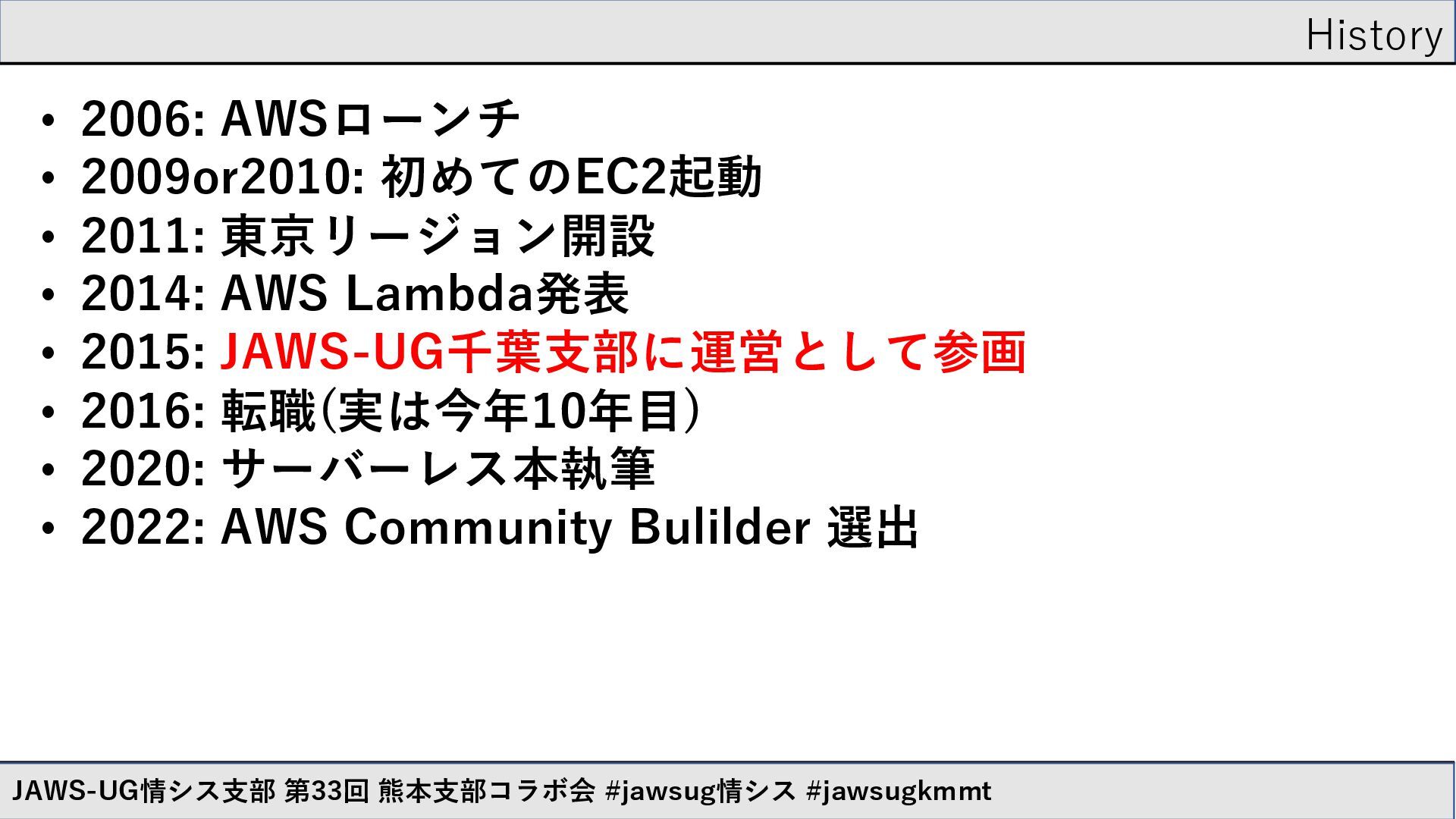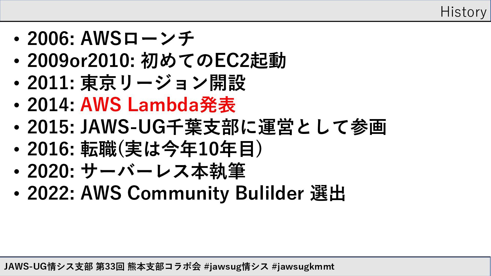 • 2014: AWS Lambda発表 • 2015: JAWS-UG千葉支部に運営として参画 • 2016: 転職(実は今年10年目) • 2020: サーバーレス本執筆 • 2022: AWS Community Bulilder 選出 JAWS-UG情シス支部 第33回 熊本支部コラボ会 #jawsug情シス #jawsugkmmt
