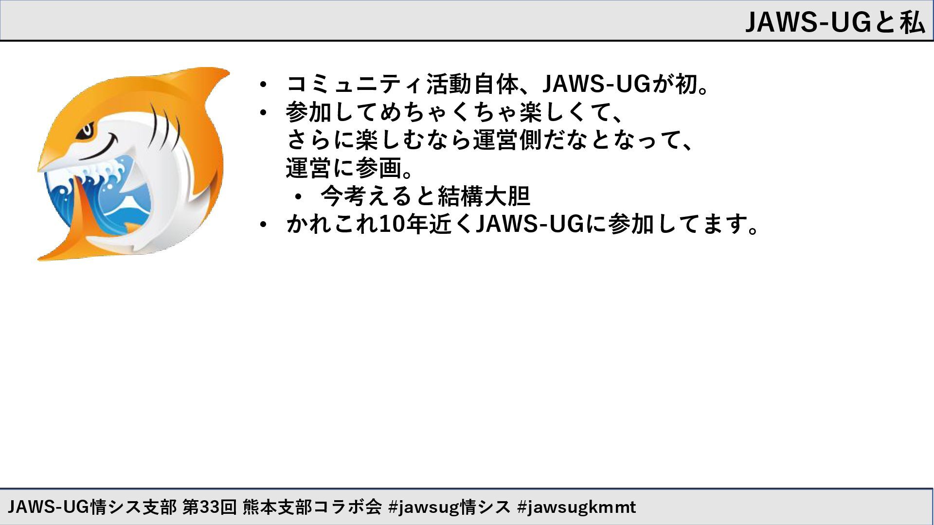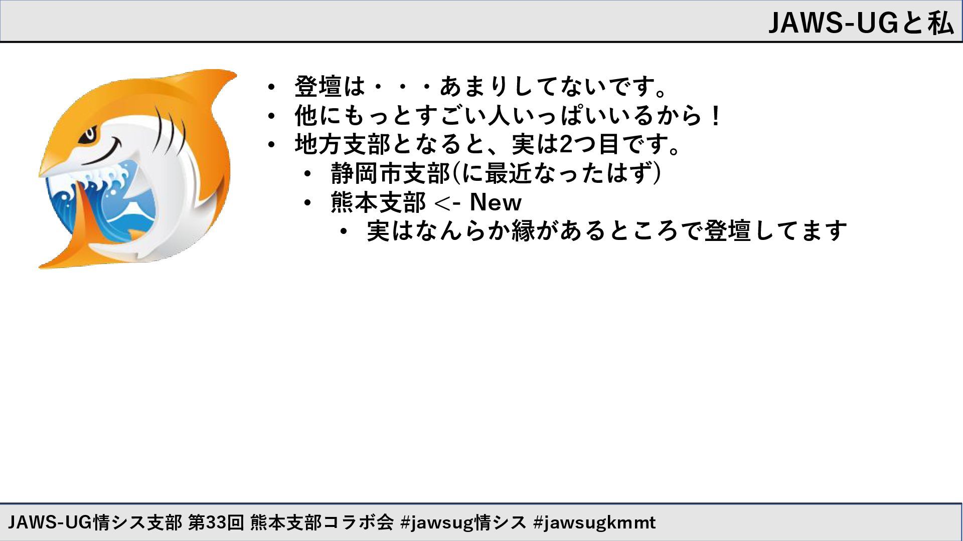 JAWS-UGと私 JAWS-UG情シス支部 第33回 熊本支部コラボ会 #jawsug情シス #jawsugkmmt JAWS-UG初参加 JAWS-UG千葉支部運営参画後初勉強会