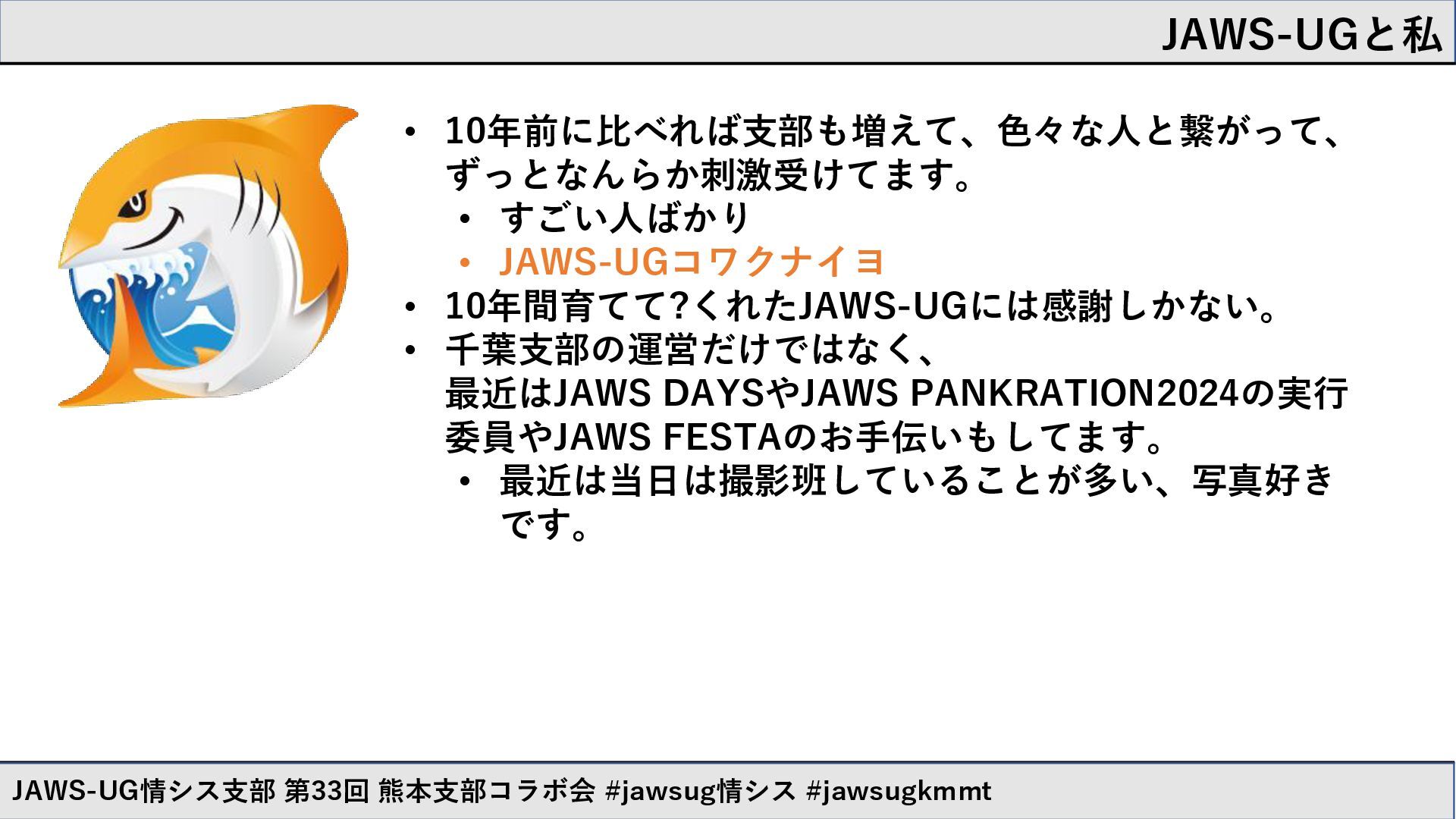 すごい人ばかり • JAWS-UGコワクナイヨ • 10年間育てて?くれたJAWS-UGには感謝しかない。 • 千葉支部の運営だけではなく、 最近はJAWS DAYSやJAWS PANKRATION2024の実行 委員やJAWS FESTAのお手伝いもしてます。 • 最近は当日は撮影班していることが多い、写真好き です。