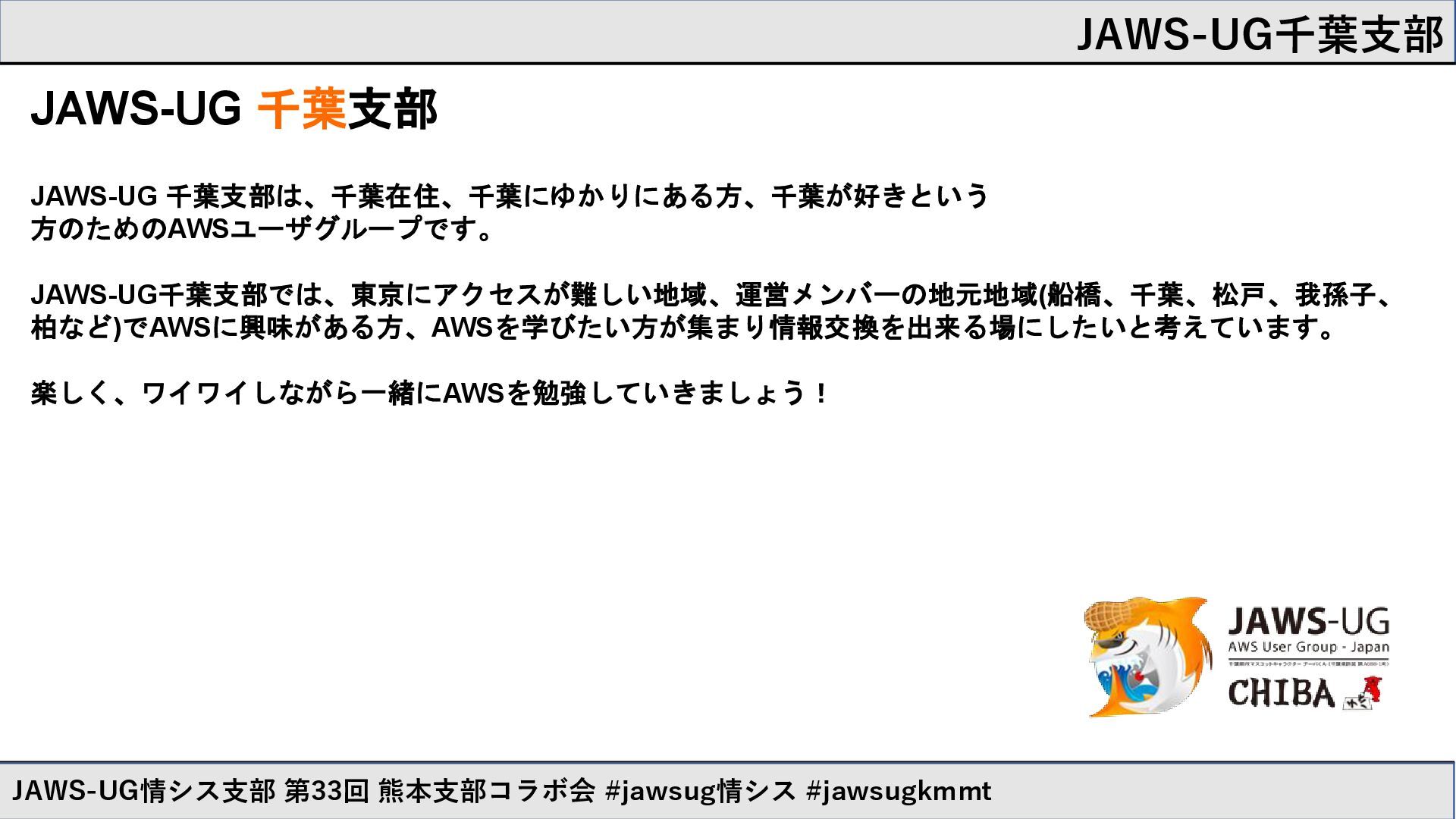 JAWS-UG千葉支部 JAWS-UG情シス支部 第33回 熊本支部コラボ会 #jawsug情シス #jawsugkmmt JAWS-UG 千葉支部 JAWS-UG 千葉支部は、千葉在住、千葉にゆかりにある方、千葉が好きという