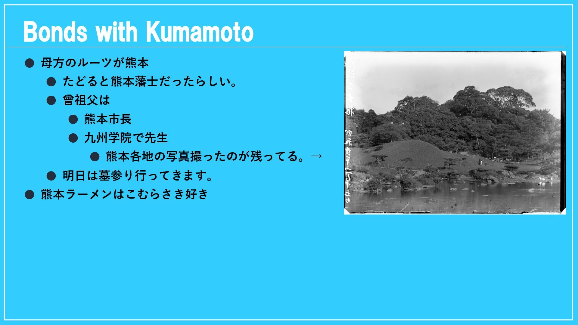 Bonds with Kumamoto • 母方のルーツが熊本 • たどると熊本藩士だったらしい。 • 曾祖父は •