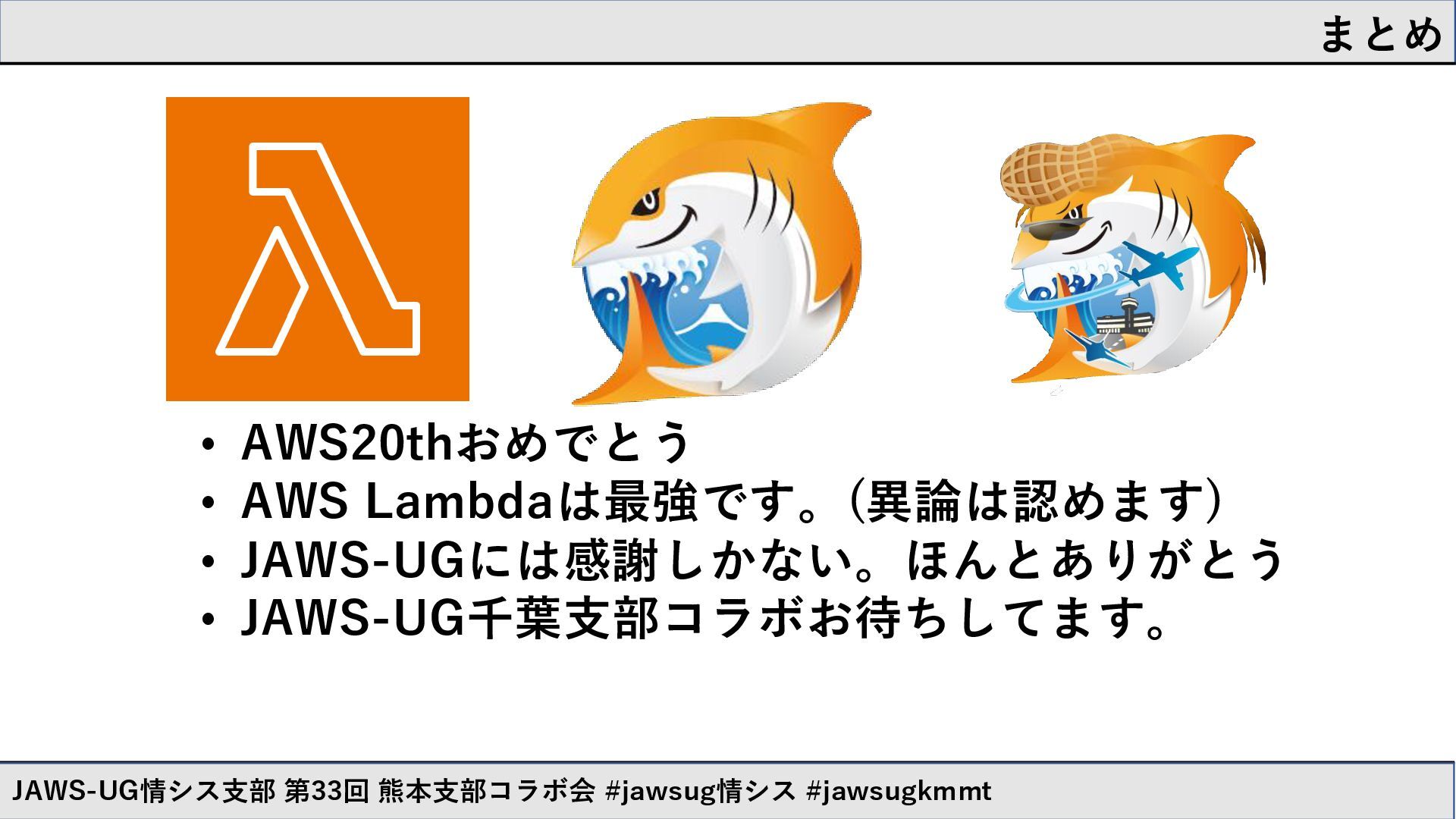 Lambdaは最強です。(異論は認めます) • JAWS-UGには感謝しかない。ほんとありがとう • JAWS-UG千葉支部コラボお待ちしてます。