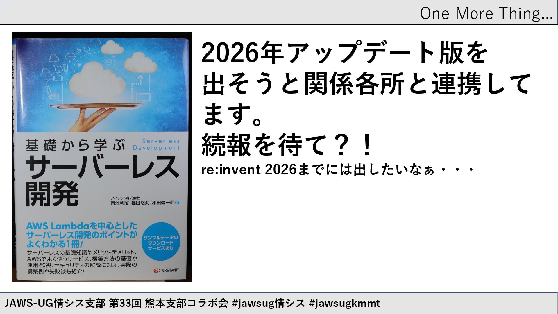 One More Thing... JAWS-UG情シス支部 第33回 熊本支部コラボ会 #jawsug情シス #jawsugkmmt 2026年アップデート版を 出そうと関係各所と連携して