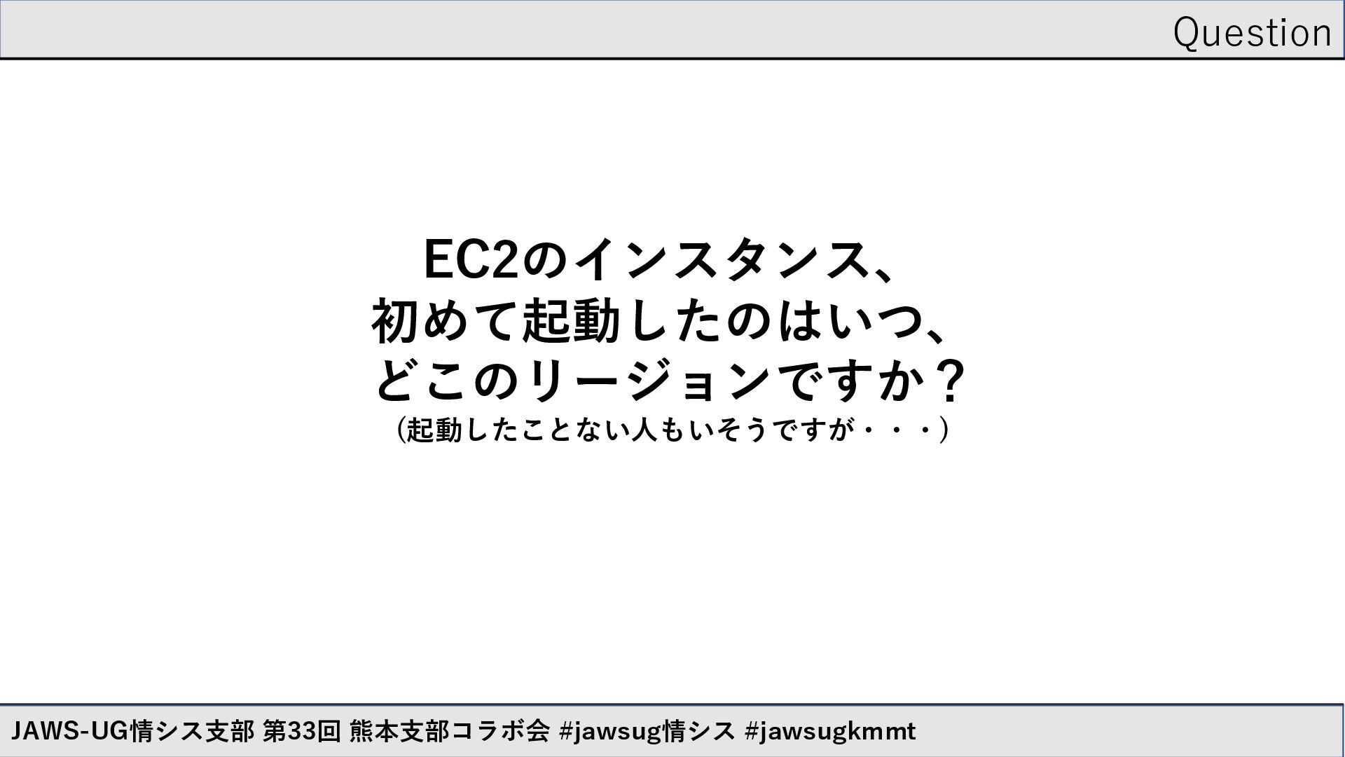 Question EC2のインスタンス、 初めて起動したのはいつ、 どこのリージョンですか? (起動したことない人もいそうですが・・・) JAWS-UG情シス支部 第33回 熊本支部コラボ会 #jawsug情シス #jawsugkmmt