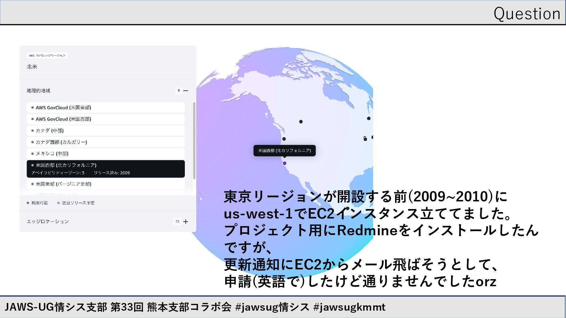 Question JAWS-UG情シス支部 第33回 熊本支部コラボ会 #jawsug情シス #jawsugkmmt 東京リージョンが開設する前(2009~2010)に us-west-1でEC2インスタンス立ててました。 プロジェクト用にRedmineをインストールしたん ですが、