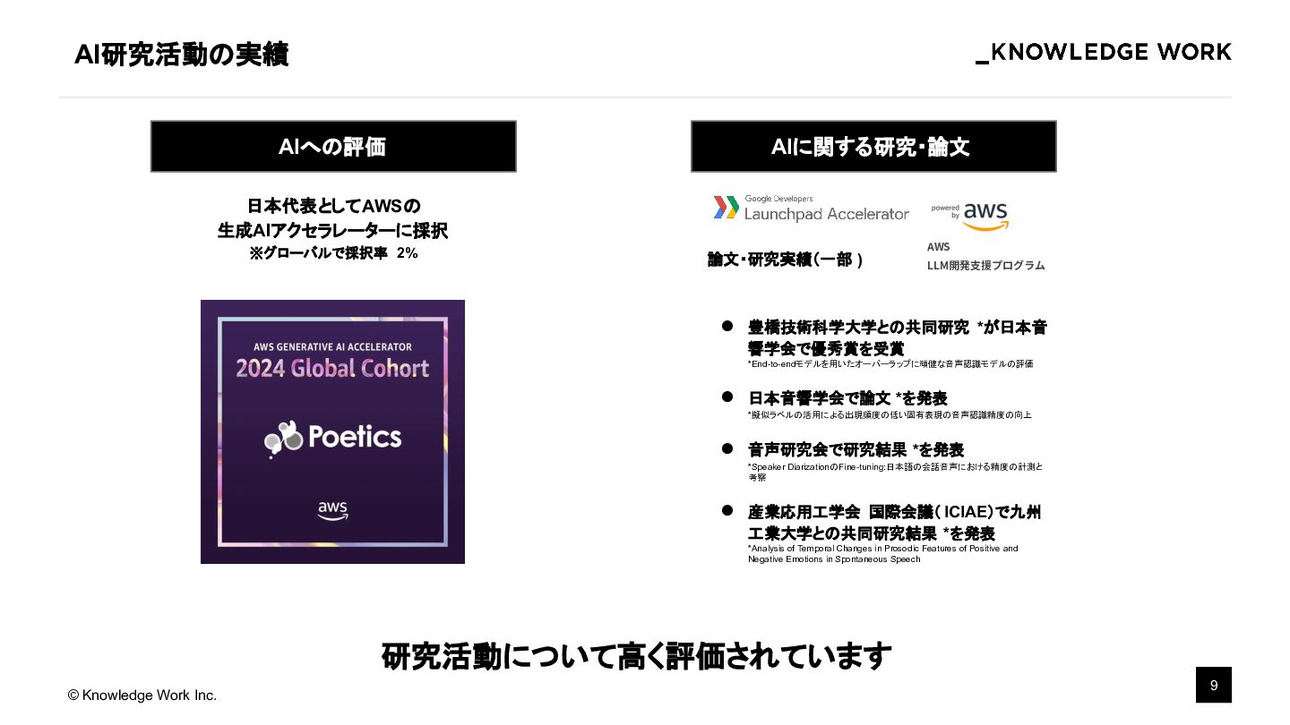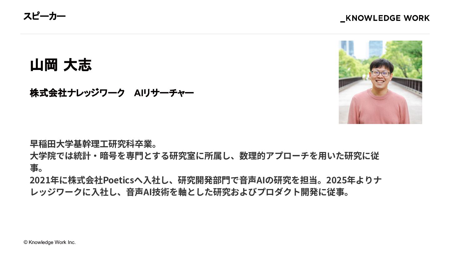 2021年に株式会社Poeticsへ入社し、研究開発部門で音声AIの研究を担当。2025年よりナレッジワークに入社し、音声AI技術を軸とした研究およびプロダクト開発に従事。