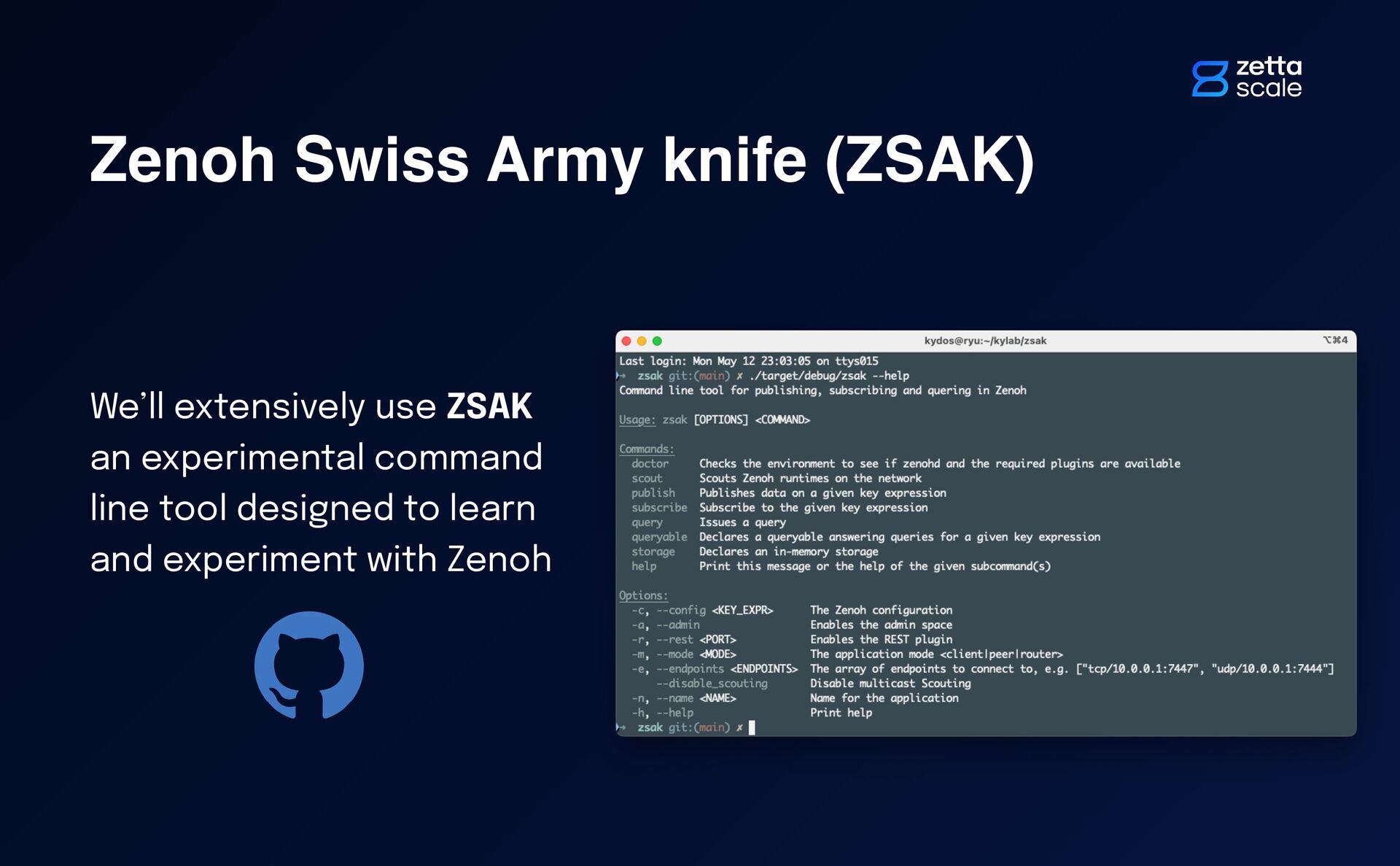 1. https://github.com/kydos/zsak Zenoh Swiss Army knife (ZSAK) We’ll extensively use ZSAK