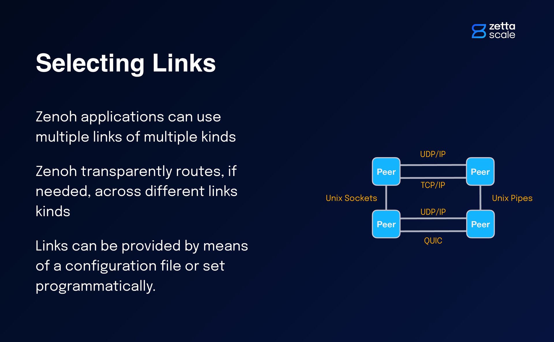 kinds Zenoh transparently routes, if needed, across di ff erent links kinds Links can be provided by means of a con fi guration fi le or set programmatically. Peer Peer Peer Peer Unix Sockets Unix Pipes UDP/IP TCP/IP QUIC UDP/IP