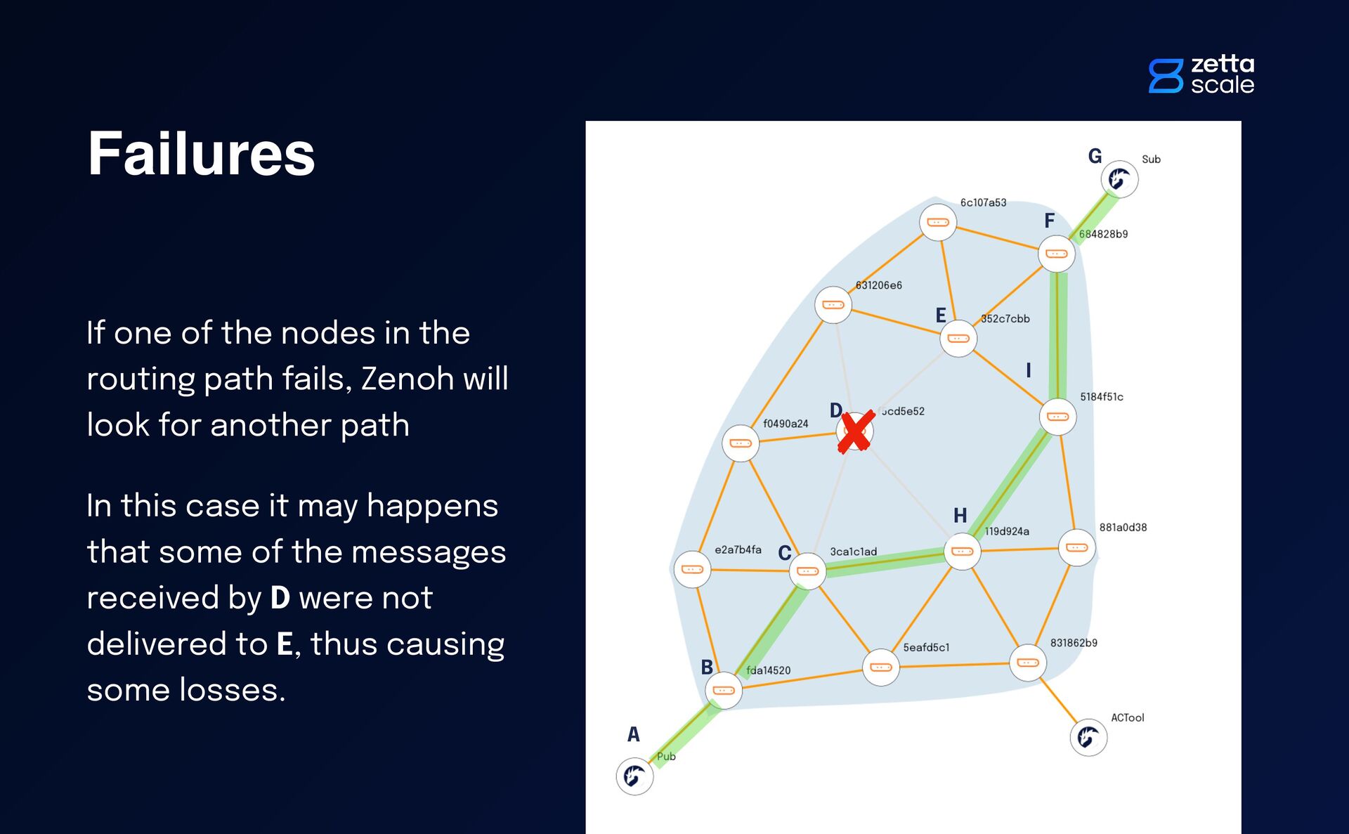 fails, Zenoh will look for another path In this case it may happens that some of the messages received by D were not delivered to E, thus causing some losses. A B C D E F G H I