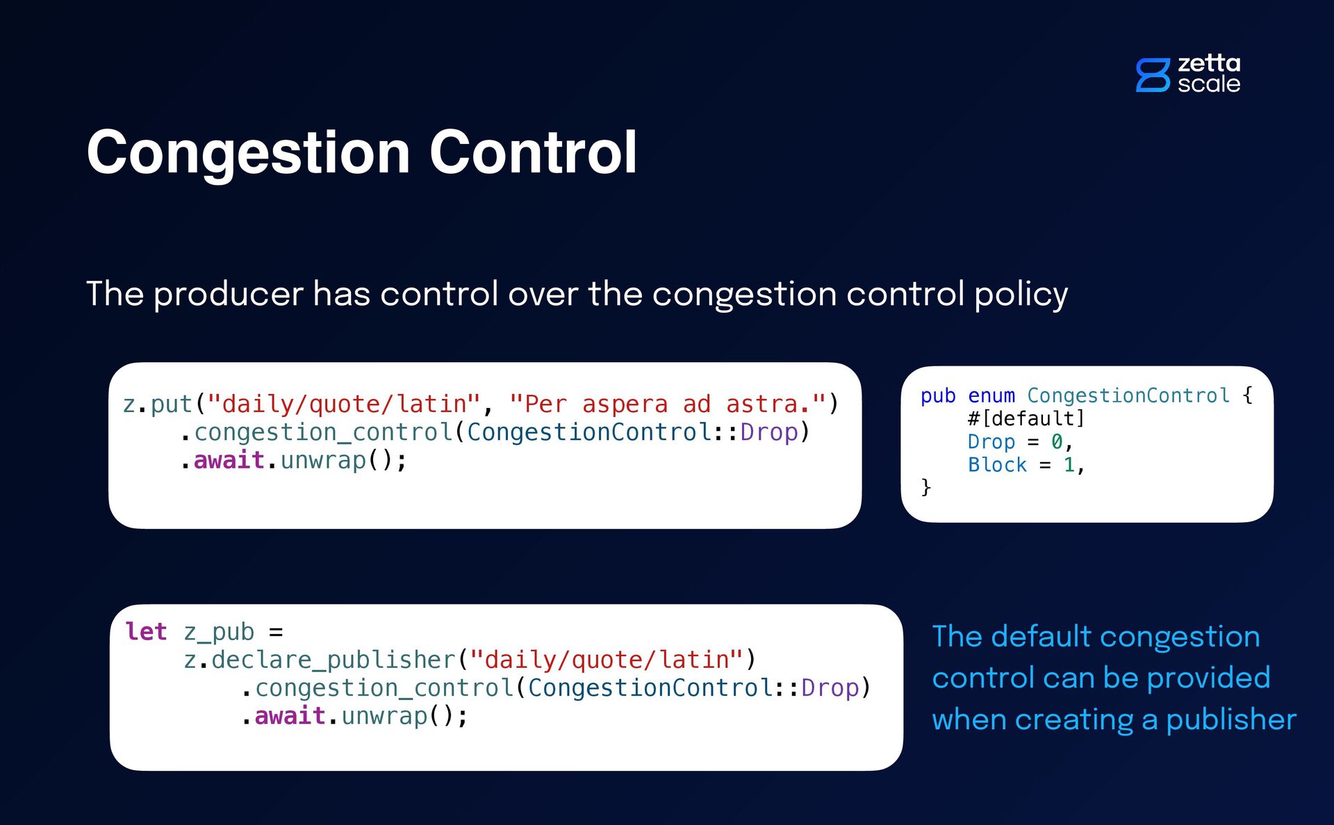 policy pub enum CongestionControl { #[default] Drop = 0, Block = 1, } z.put("daily/quote/latin", "Per aspera ad astra.") .congestion_control(CongestionControl::Drop) .await.unwrap(); let z_pub = z.declare_publisher("daily/quote/latin") .congestion_control(CongestionControl::Drop) .await.unwrap(); The default congestion control can be provided when creating a publisher