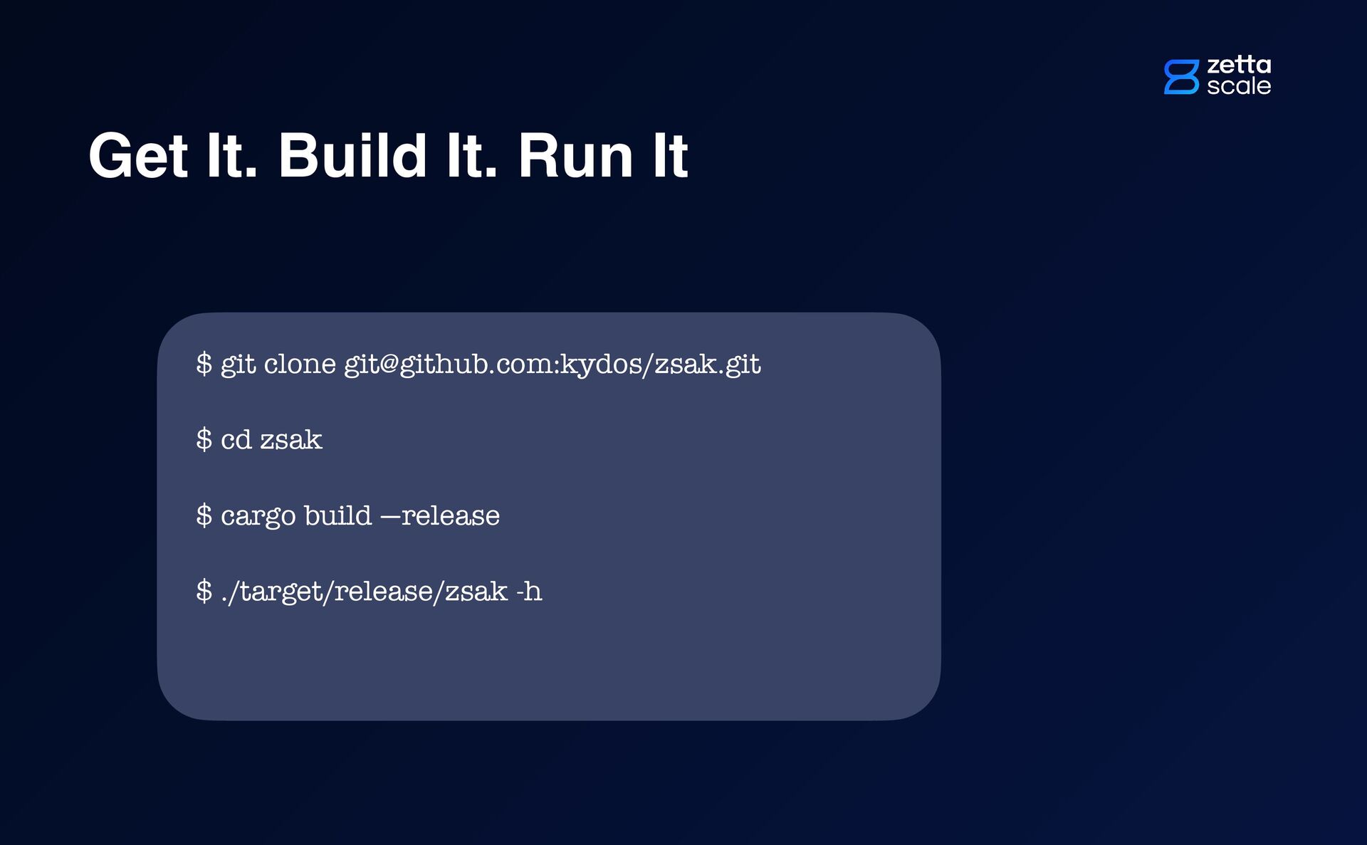 $ cd zsak $ cargo build —release $ ./target/release/zsak -h