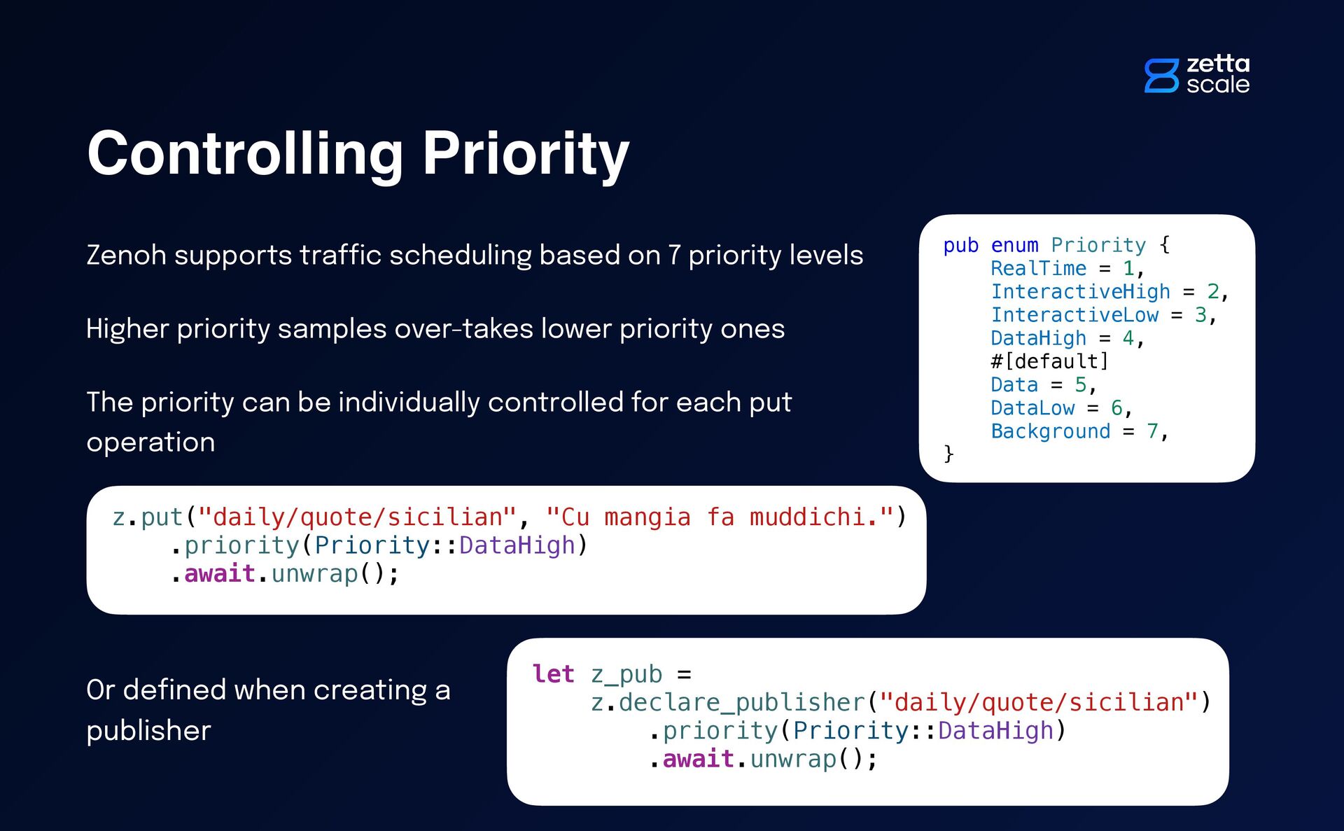 = 2, InteractiveLow = 3, DataHigh = 4, #[default] Data = 5, DataLow = 6, Background = 7, } let z_pub = z.declare_publisher("daily/quote/sicilian") .priority(Priority::DataHigh) .await.unwrap(); Zenoh supports tra ffi c scheduling based on 7 priority levels Higher priority samples over-takes lower priority ones The priority can be individually controlled for each put operation Or de fi ned when creating a publisher z.put("daily/quote/sicilian", "Cu mangia fa muddichi.") .priority(Priority::DataHigh) .await.unwrap();