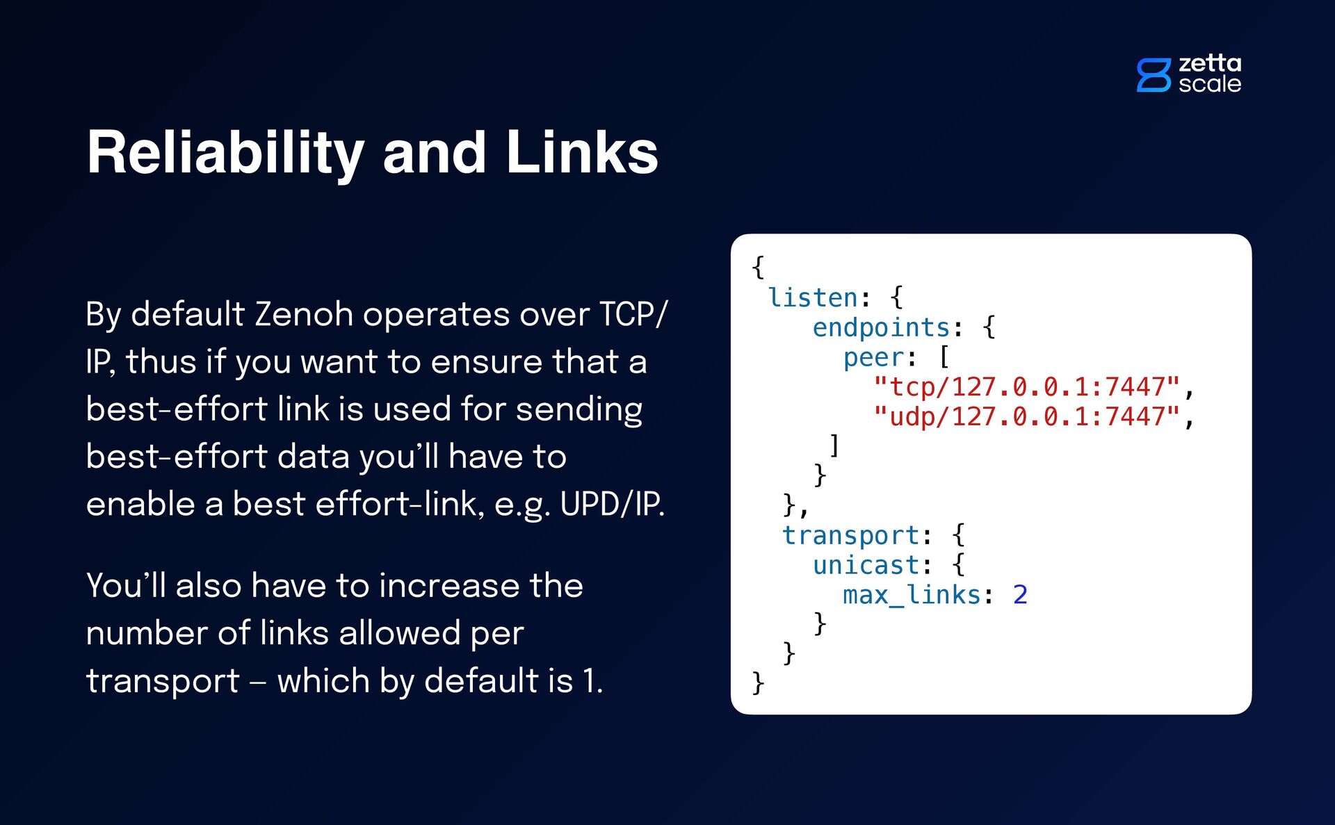 thus if you want to ensure that a best-e ff ort link is used for sending best-e ff ort data you’ll have to enable a best e ff ort-link, e.g. UPD/IP. You’ll also have to increase the number of links allowed per transport — which by default is 1. { listen: { endpoints: { peer: [ "tcp/127.0.0.1:7447", "udp/127.0.0.1:7447", ] } }, transport: { unicast: { max_links: 2 } } }