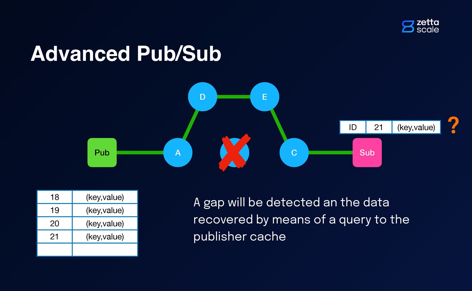 B Pub Sub D E A C ? ID 21 (key,value) A gap will be detected an the data recovered by means of a query to the publisher cache