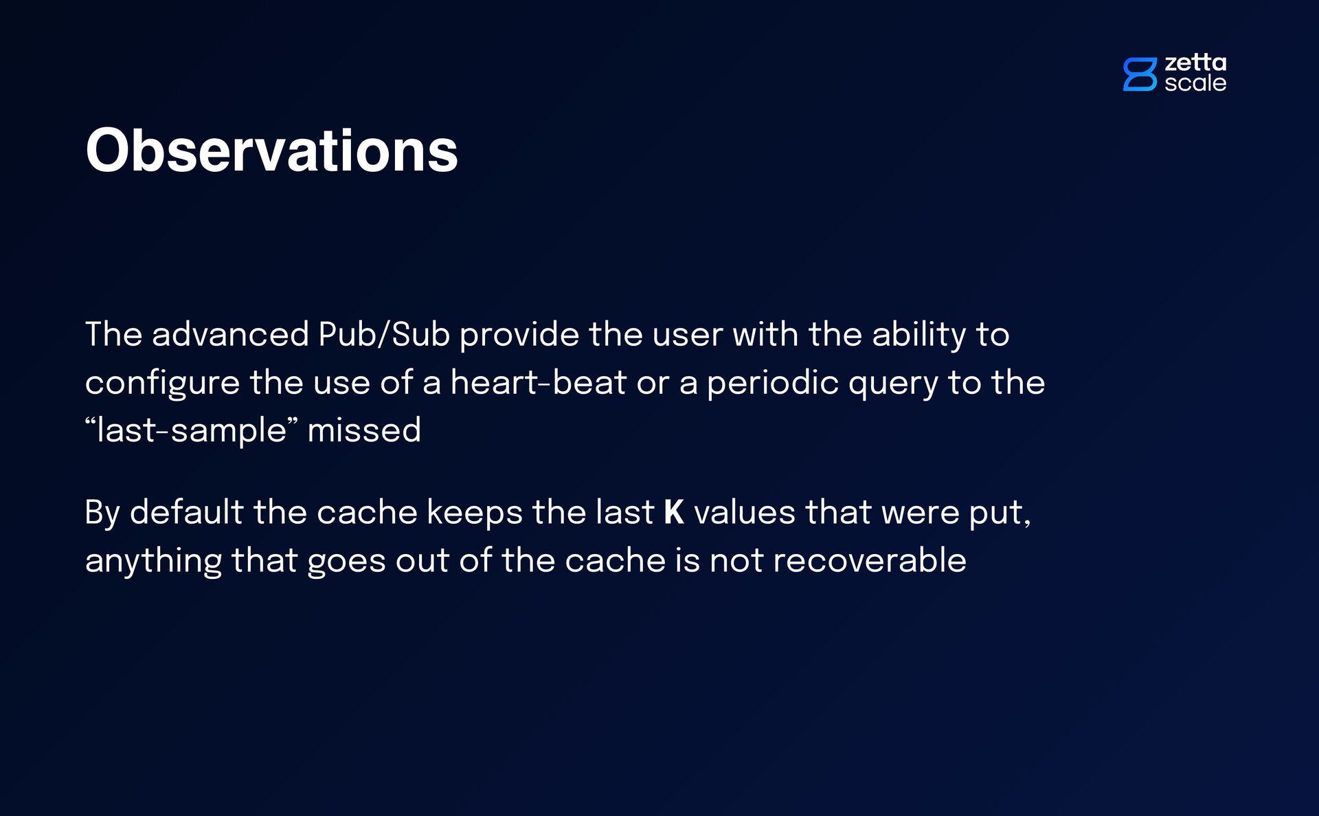 to con fi gure the use of a heart-beat or a periodic query to the “last-sample” missed By default the cache keeps the last K values that were put, anything that goes out of the cache is not recoverable