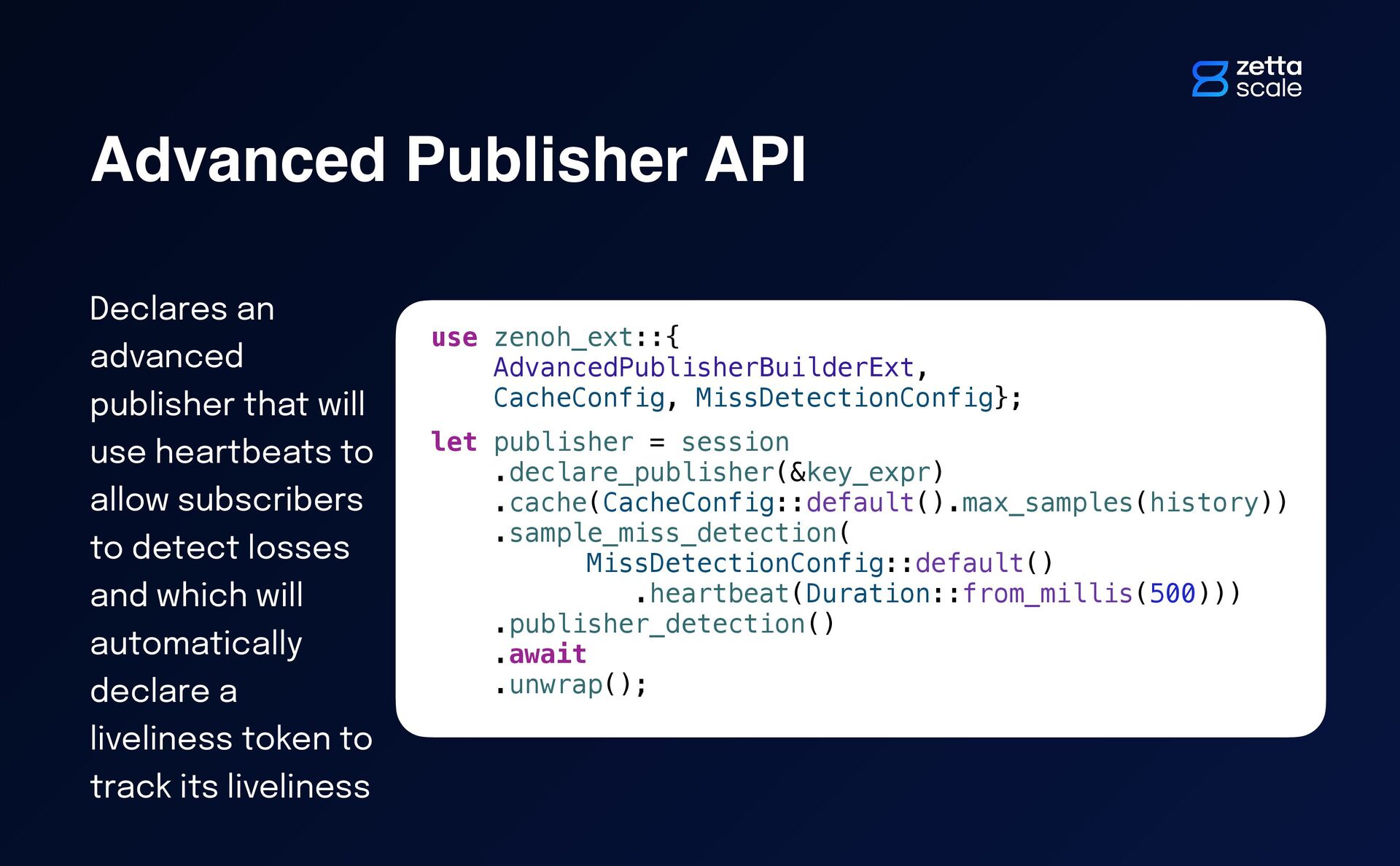 heartbeats to allow subscribers to detect losses and which will automatically declare a liveliness token to track its liveliness use zenoh_ext::{ AdvancedPublisherBuilderExt, CacheConfig, MissDetectionConfig}; let publisher = session .declare_publisher(&key_expr) .cache(CacheConfig::default().max_samples(history)) .sample_miss_detection( MissDetectionConfig::default() .heartbeat(Duration::from_millis(500))) .publisher_detection() .await .unwrap();