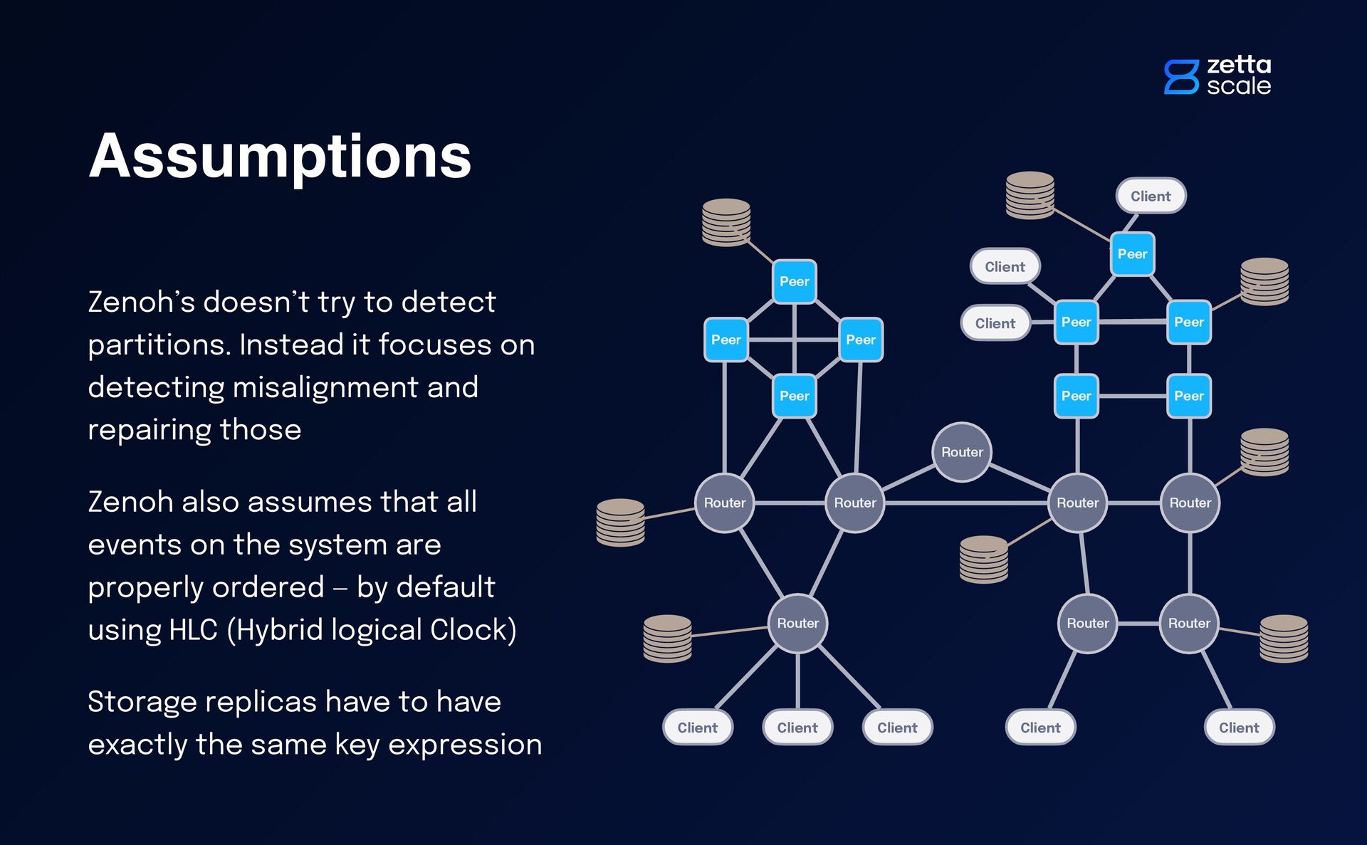 on detecting misalignment and repairing those Zenoh also assumes that all events on the system are properly ordered — by default using HLC (Hybrid logical Clock) Storage replicas have to have exactly the same key expression Router Router Router Router Router Client Client Peer Peer Peer Peer Peer Router Client Client Client Client Router Router Client Peer Peer Peer Peer Client