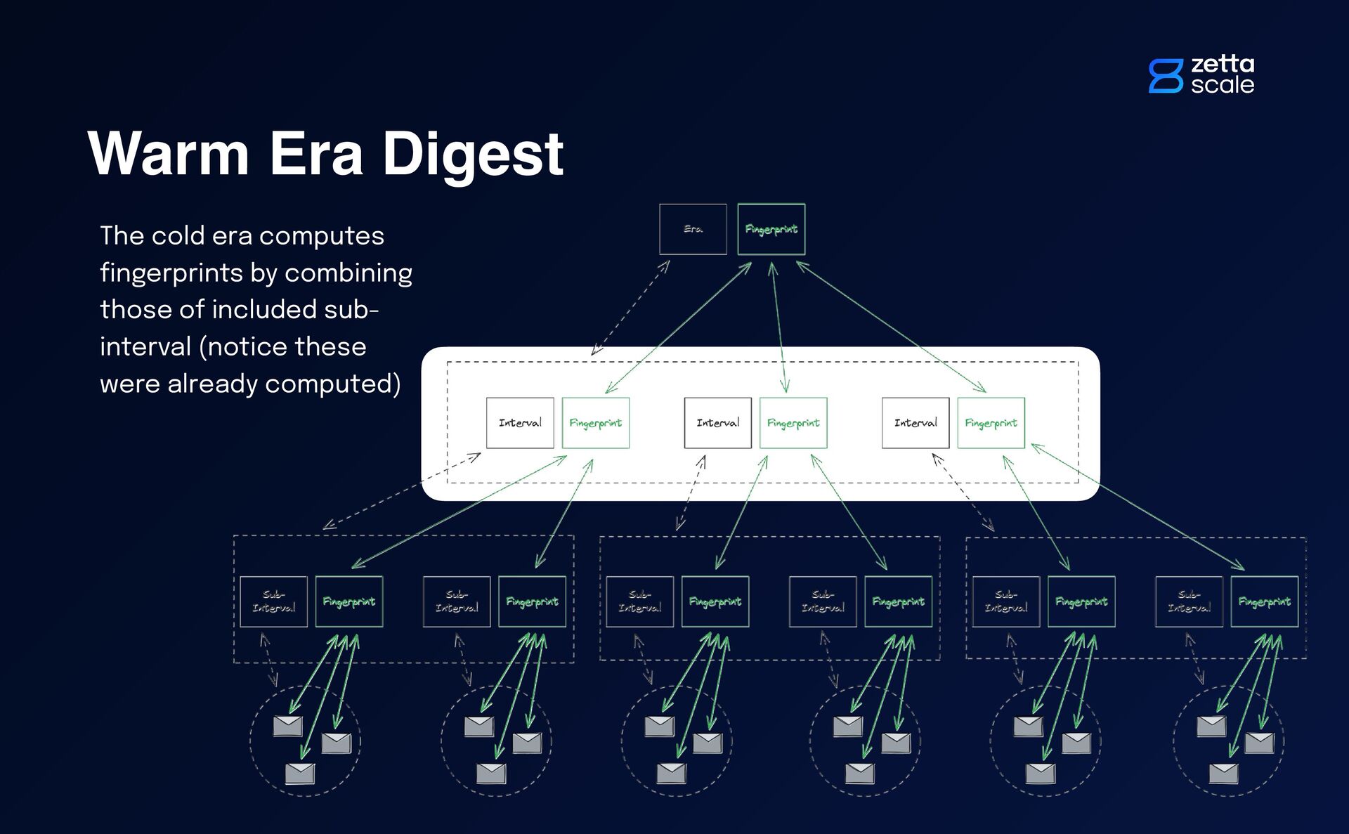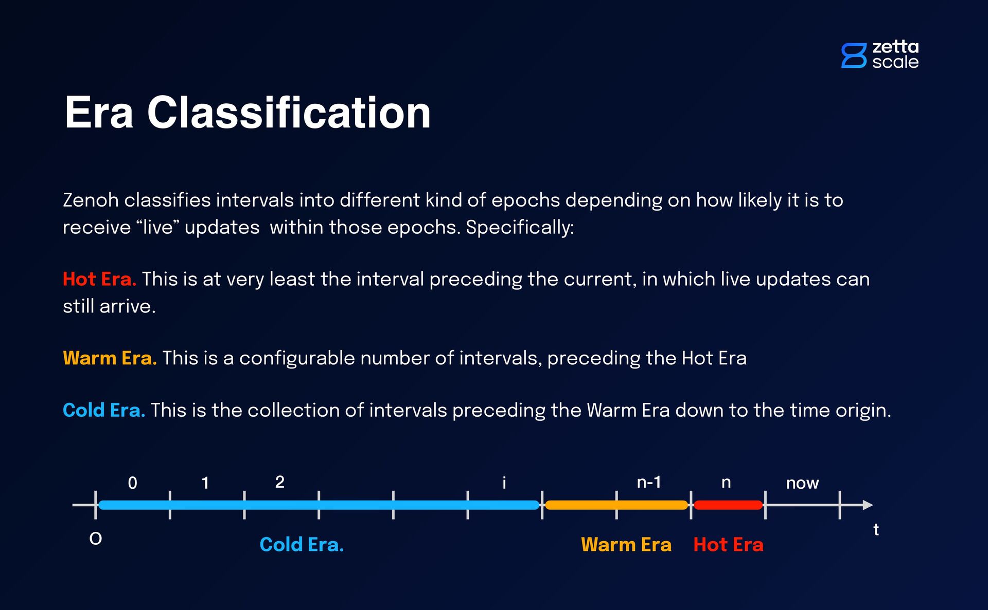 di ff erent kind of epochs depending on how likely it is to receive “live” updates within those epochs. Speci fi cally: Hot Era. This is at very least the interval preceding the current, in which live updates can still arrive. Warm Era. This is a con fi gurable number of intervals, preceding the Hot Era Cold Era. This is the collection of intervals preceding the Warm Era down to the time origin. ... O t 0 1 2 i n now n-1 Hot Era Warm Era Cold Era.