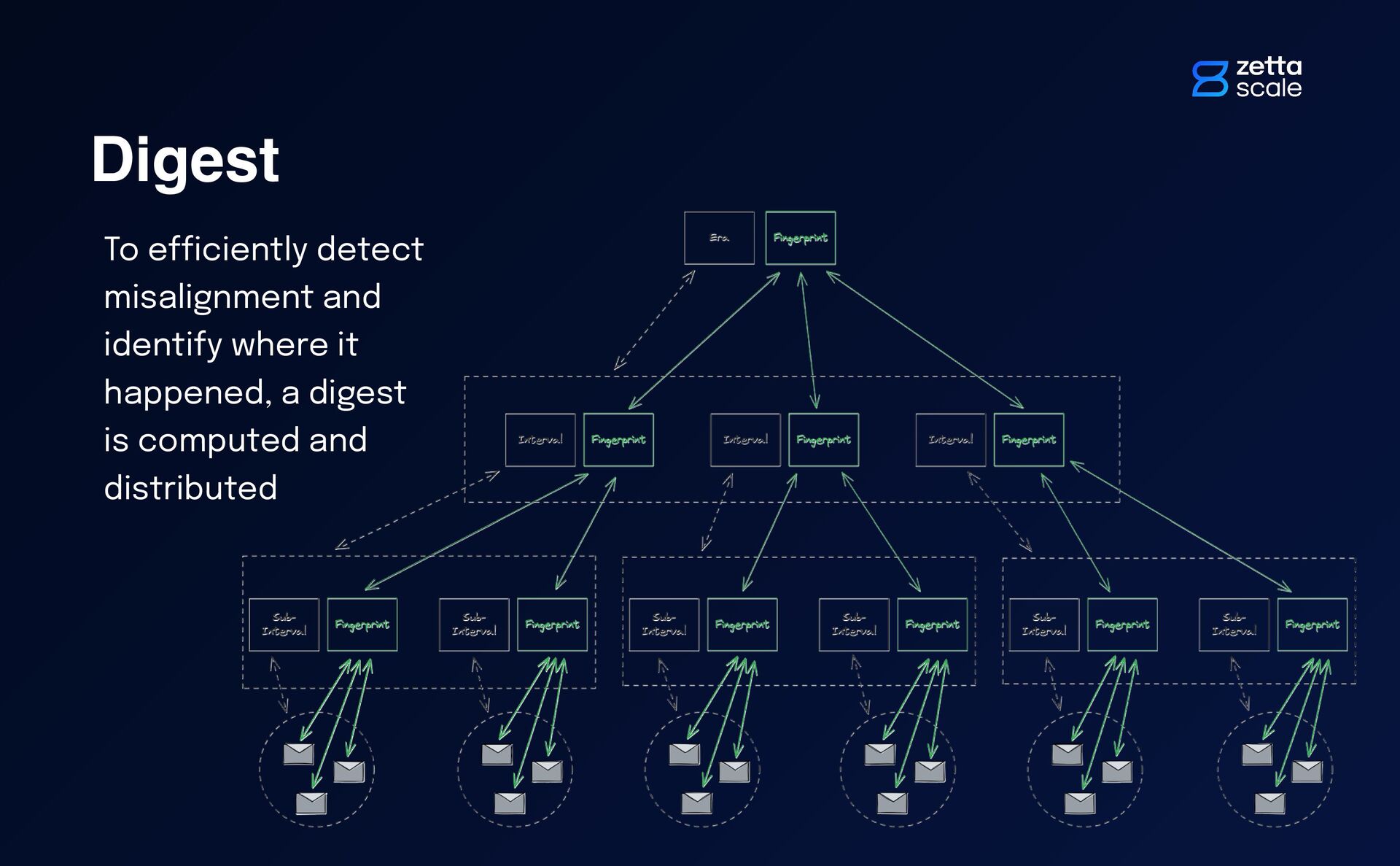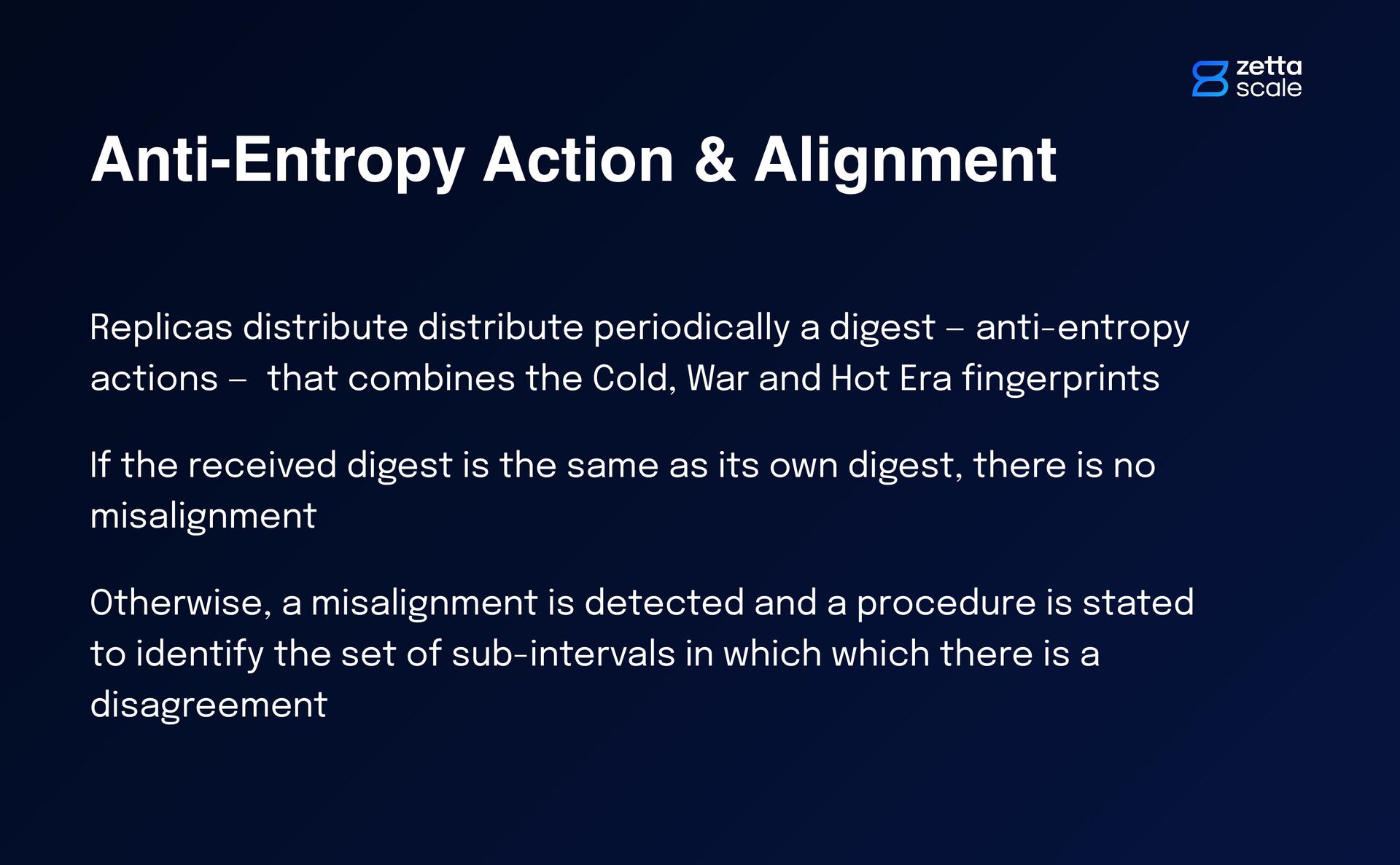— anti-entropy actions — that combines the Cold, War and Hot Era fi ngerprints If the received digest is the same as its own digest, there is no misalignment Otherwise, a misalignment is detected and a procedure is stated to identify the set of sub-intervals in which which there is a disagreement